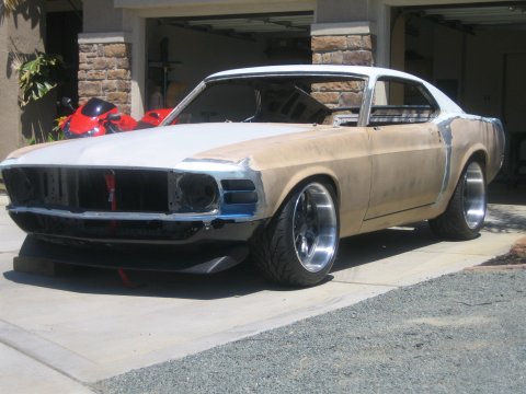 I posted a few months ago when I first started this project and thought I'd post some pics of the progress. after some extensive body work,(quarters, floorpans, shock tower, lowered rockerpanels, sidemarkers filled ect.) it's in the final blocking stages now and should be ready for paint in the next week or so.I'm still deciding on HOK tangelo or a dark candy red (help!). Window trim, spoilers, and stripes on hood will be dark grey same as wheel centers. Engine is a pretty stout 302 with a fogger system, backed by a big block toploader with hydraulic clutch. Suspension is total control front and rear (g-bar in rear) wilwood all the way around, including triple master pedals, and steeroids rack. Tires are 295 35 19 and 255 40 18 with budnik cannons. Interior includes 2005 bmw seats with integreted belts, fold down rear seat and full autometer year one dash.Anyway I have most of the pieces and as soon as the paint is done it might start to look like a real car!