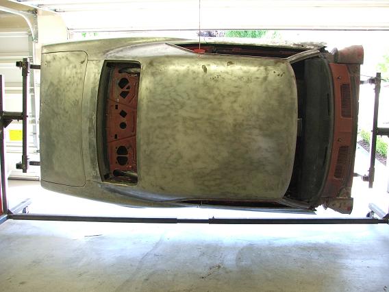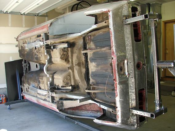 Well after a VERY long night I managed to get the car stripped down to the shell and onto the rotisserie!! After I clean up the garage a bit I can start cleaning and prepping the bottom for paint as well as some finish welding...then it's body and paint time!!