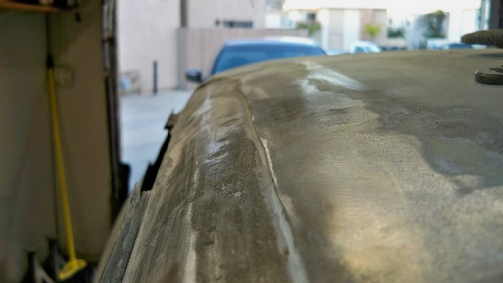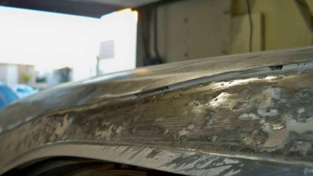 See the pitting, and the outline of a newer piece of metal. it's held on by??? the bondo maybe?