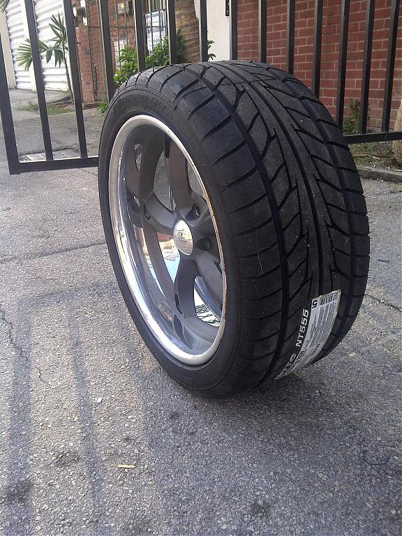 rear 18x9, 5 x 4.75 BP, 6.0 BS, polished outer, with Nitto 275/35/18 NT-555