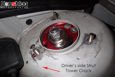The second common weak point on the E46 chassis, as with many McPherson strut cars, is in the actual strut towers. The sheet metal is a bit on the thin side and virtually all of the vertical suspension loads pass through the strut and into the chassis via these two towers. With a big enough impact you can deform or crack the sheet metal here. It's even worse with sticky race tire loads. Sometimes the towers develop cracks simply from fatigue - again, soft bushings allow for a lot of extra squishy movement, which flexes the metal over time.