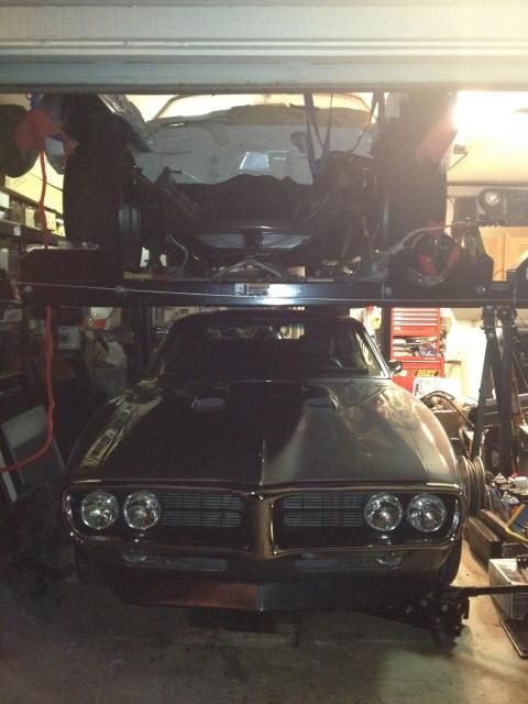 When we purchased our house it was just dumb luck that the garage had a 12' ceiling. Shortly after moving in, I purchased a 4 post lift and simply stored the Camaro on it for many years before starting my PT build. My lift is not anchored and in fact Stinger sells a wheel kit that will actually allow you to move the lift around. I can tell you that there is no way I could have built Dust Off alone without this lift! It was the best investment I have ever made in shop tools. A lift with a 9' ceiling will not be suitable for working under the car unless you can come up will some method of working in a 4' or 5' overhead. My neighbor liked my lift and decided he wanted one in his garage but he only had 9' clearance. He went in and modifed his roof trusses to allow him to raise the car up into the attic space of his garage. As for earthquakes, we had a 7 magnitude quake here is VA a couple of years ago and the car and lift moved about an inch but suffered no damage of any kind. That same quake did crack my basement walls however. For the garage door, I modified the track to raise the door up close to the ceiling and changed the spring and cable system to a torsion spring opener.
