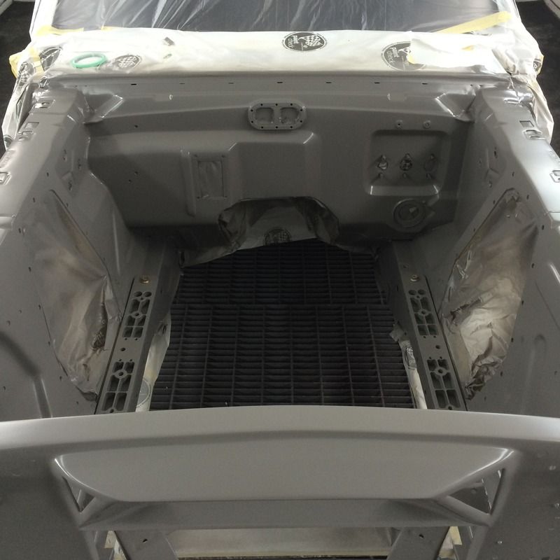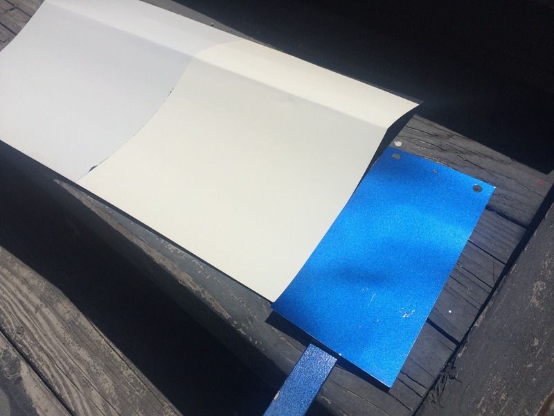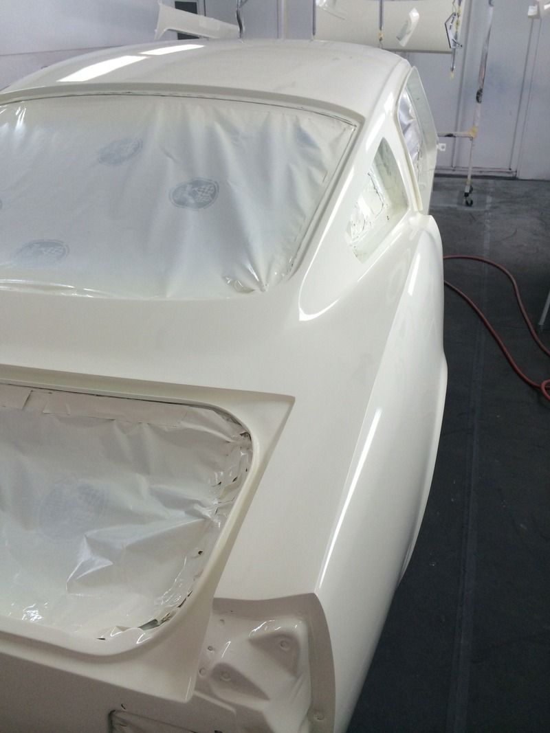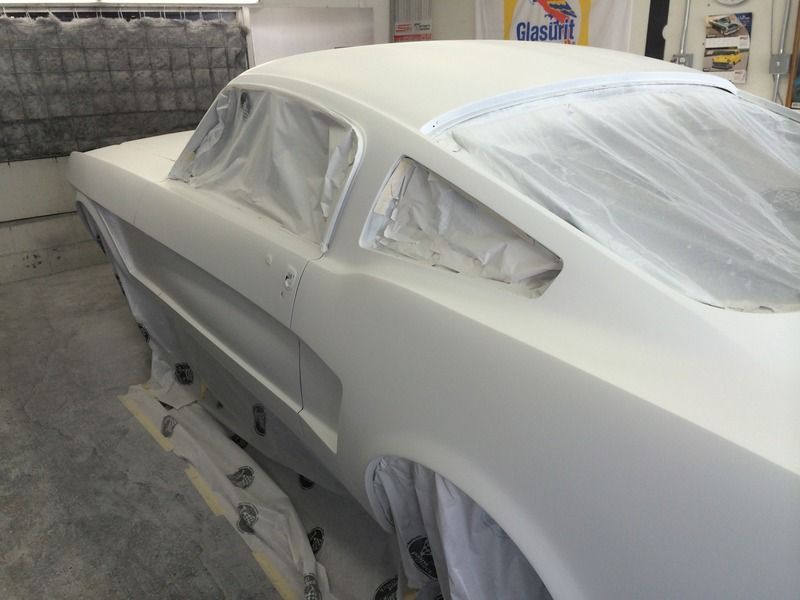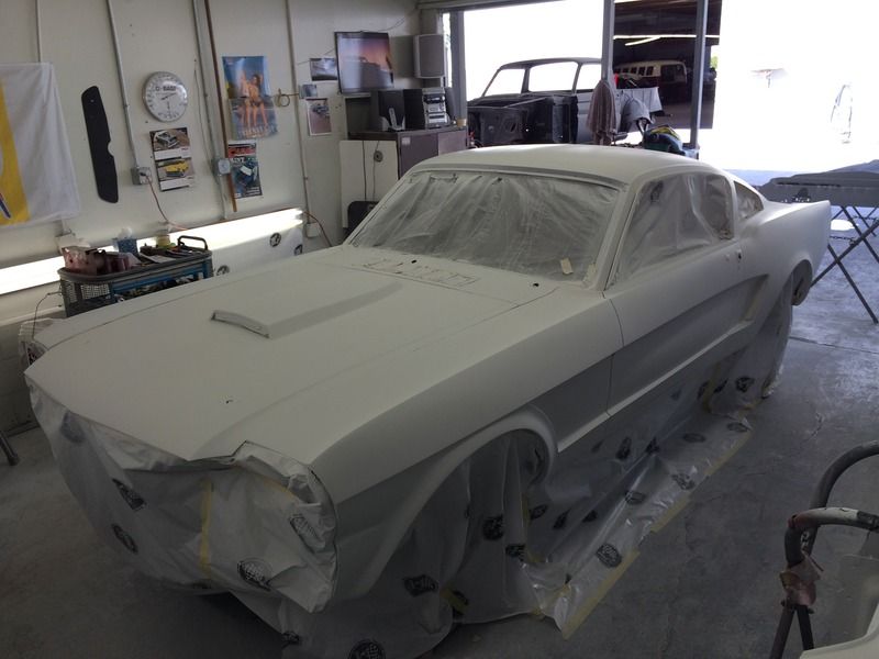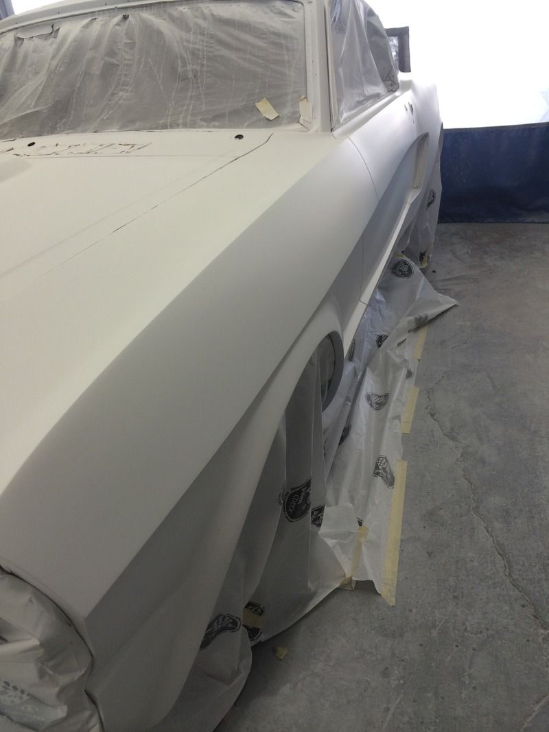 Ok, now for colors! I've probably been driving myself, and everyone I know, crazy trying to find a white and blue that I think works together to create a vintage feel like the original Wimbledon White/Guardsman Blue cars. the '65 GT350s are iconic cars, and I think we can all close our eyes and imagine what they look like, which is great, but wimbledon white actually looks kind old, dirty, and brown in person, especially on an entire car. I never realized a lot of the newer whites lean towards a grayish, greenish tint, which isn't what I was looking for, so we did a couple spray outs and picked this color on the right of the test panel. It's just a tiny bit less brown, and a little brighter than Wimbledon white, which was the original color of the car, BTW.