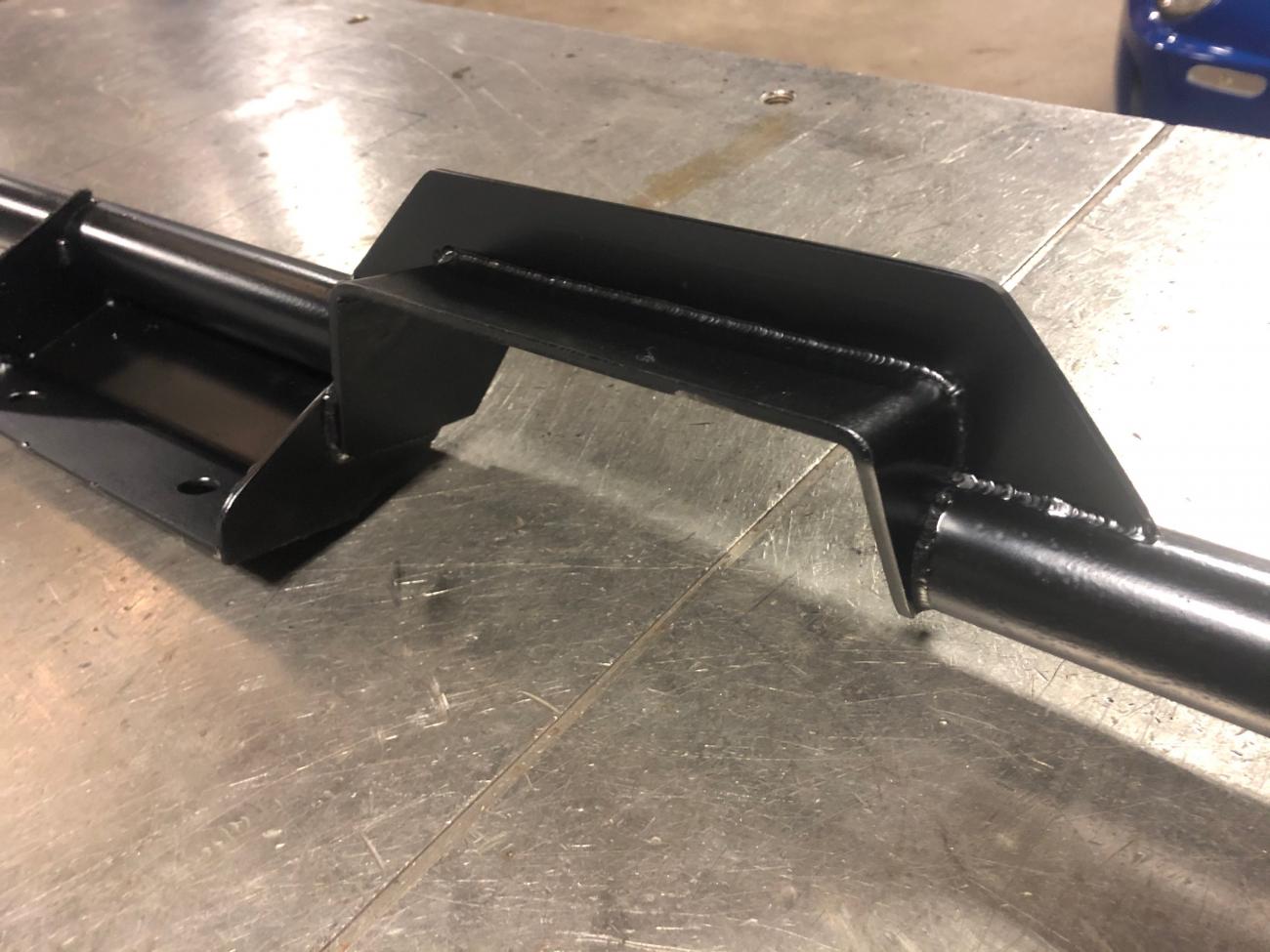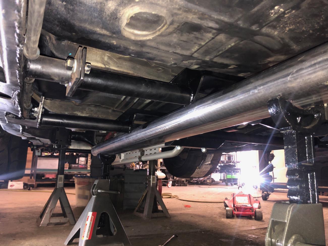 Of course the transmission and torque arm mounts had to be notched/clearanced to clear the 4" exhaust. You can see on the frame the welds from the frame boxing kit they added to further stiffen it up.