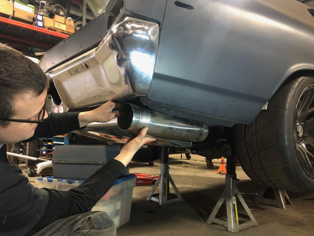 Last but not least Chris and team put back the hot side on the car and then started where the 4" downpipe terminated at the firewall to finish the exhaust which is 4" ovalized s/s tubing and a single 4" race muffler. We were planning to put an e-cutout on there by the firewall or just past it; however there doesn't seem to be much room. The lowest part on the car is the torque arm so far.