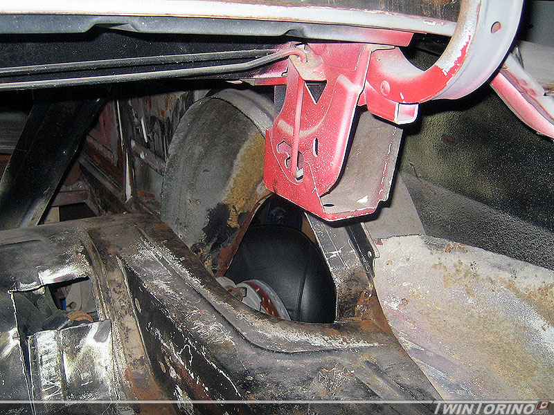 Had to cut holes in the trunk floor so the upper control arms on the IRS would fit. Also hitting the pinion snubber and will hit the jounce bumper brackets, so those will have to go away too. This all needs to be done so the car can have a lower stance and still sit at the correct "design" position as it was designed (and not just at some arbitrary control arm angle).