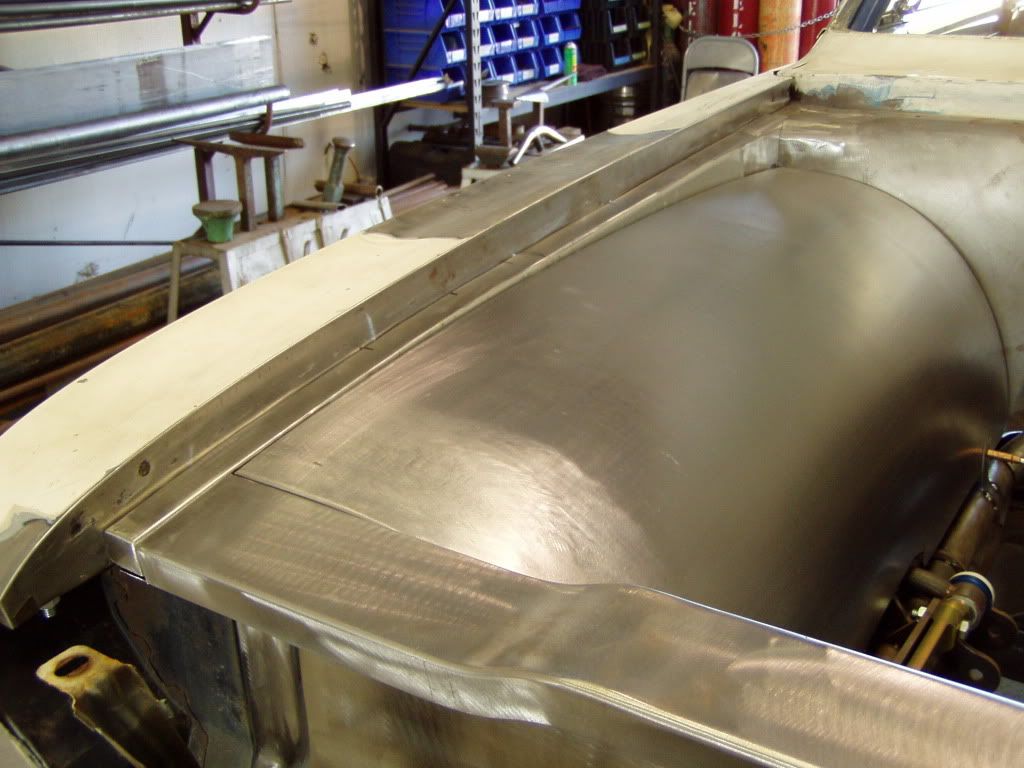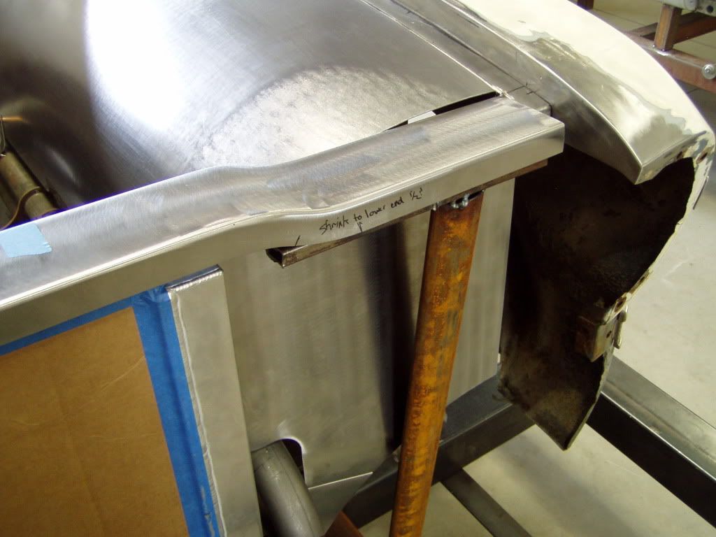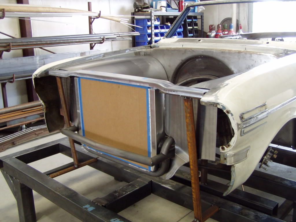 This shot shows the top of the support intersecting the fenderwell after the initial fitting of the core support in the car (no headlight buckets yet).