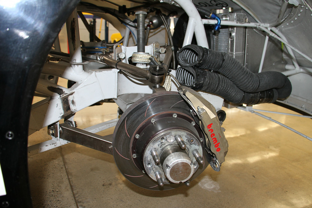 The white contraption to the right of Greg Weld's car is a pull down machine where we simulate suspension dive & roll to test travel, geometry & tire loading. (Not to be confused with a 7-post shaker.)