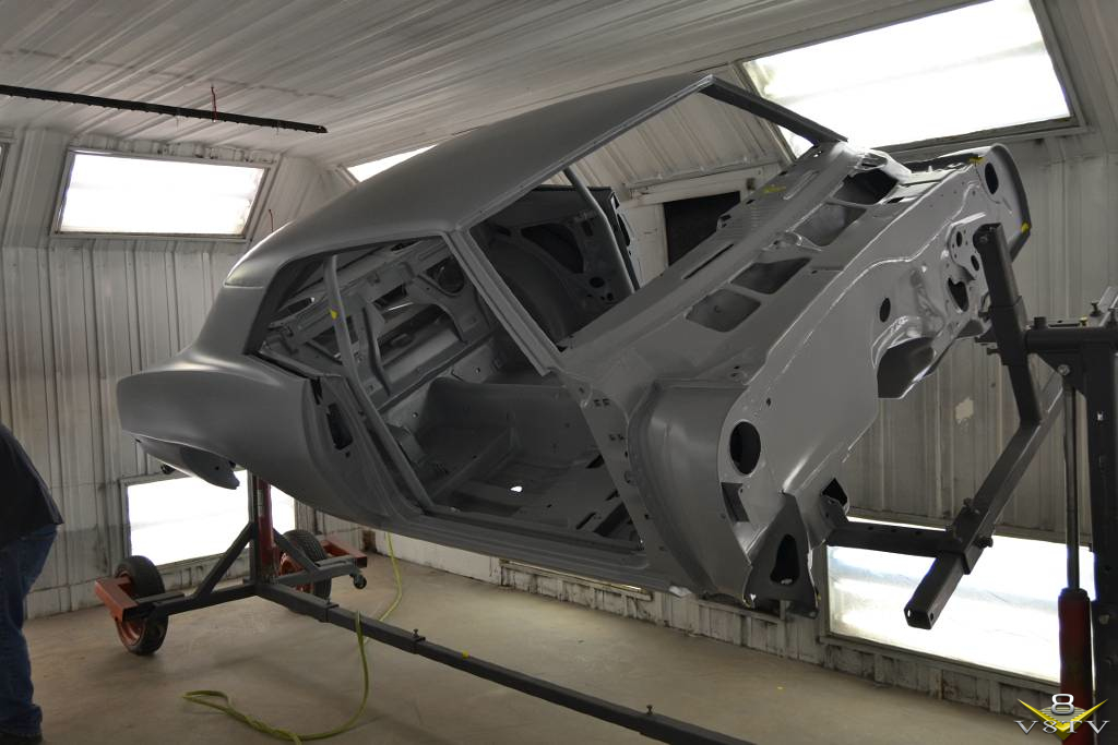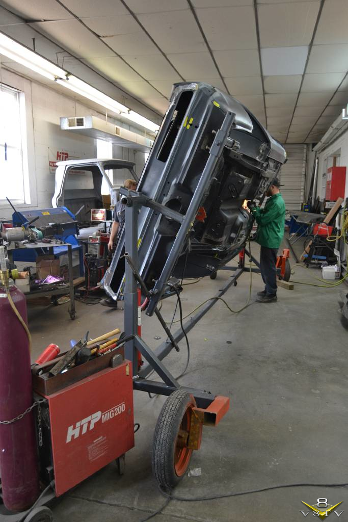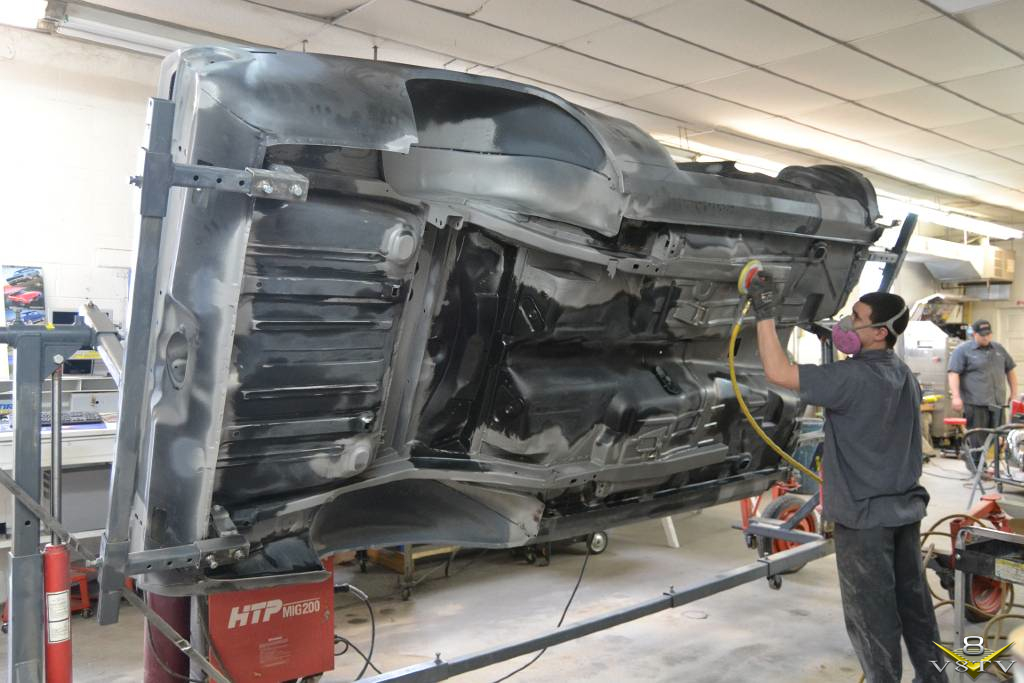 Once stripped, the body shell was attached to a rotisserie for detail welding, grinding, and eventually media blasting.