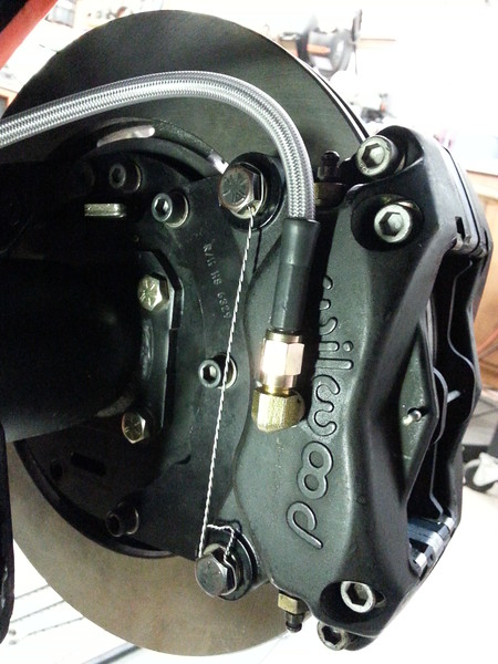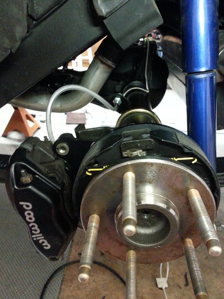 There's light at the end of the tunnel! 2 lb. residual valve installed, backing plates located and torqued, caliper brackets shimmed, line brackets painted, lines mounted, wheel clearances verified, Moser C-clip axles are in and the differential refilled. Basically all that's left is to measure e-brake cable lengths and order and bleed the system.