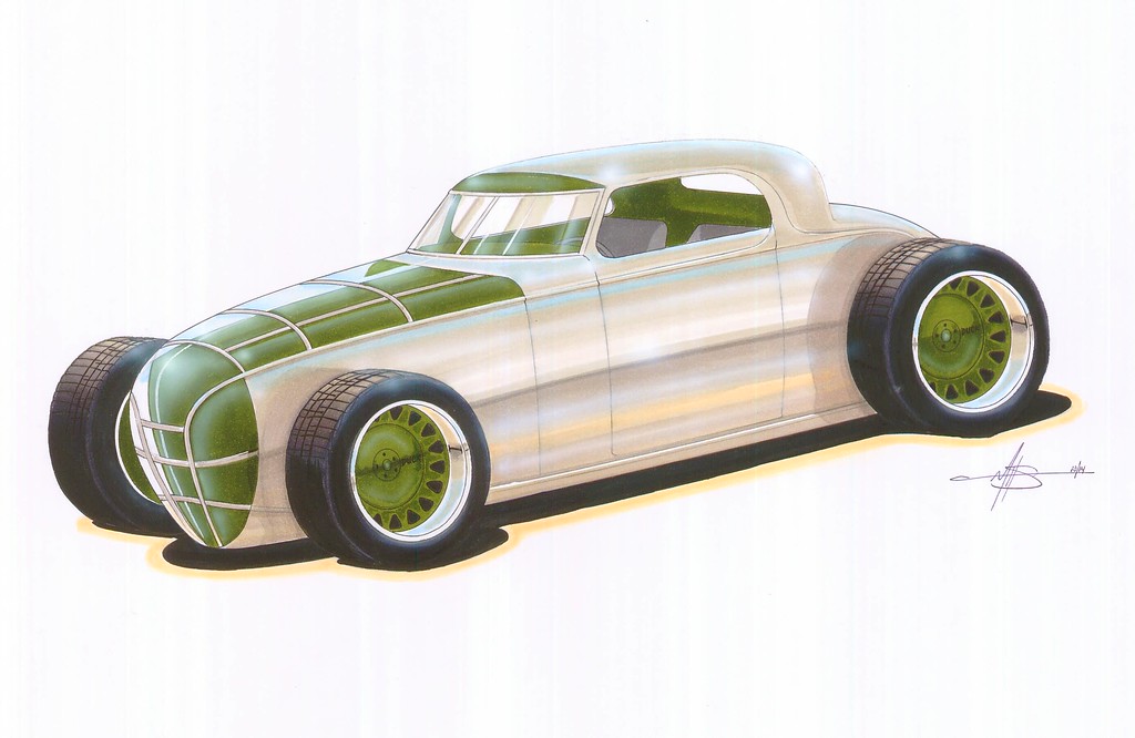This 100% hand-built aluminum body will incorporate the design and styling of the B-25 Mitchell bomber glass nose and windshield, with the three window 30s coupe rear roof and truck shapes. The car will feature a full belly pan and B-25 bomber inspired wheels.