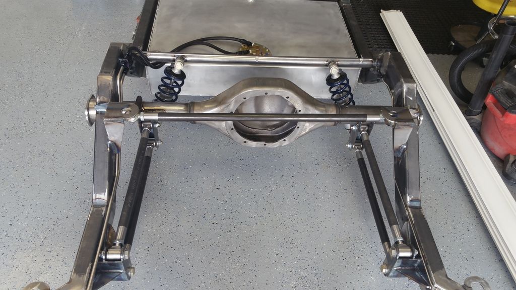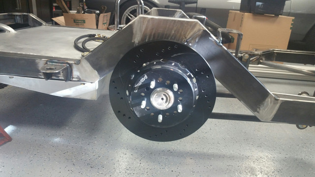 Brakes are on front and rear (without calipers due to not having wheels big enough to handle them yet) and it's in rolling form. I borrowed an older LS truck motor from a mechanic friend, just for test fitting the body on the frame. We set the body on last weekend (half assed) and it looks like the only cutting I may have to do is in the trunk hump area and possibly a little at the front of the tunnel. I'll be doing the cutting tomorrow to see how it goes. Judging from how it sets on the frame right now, I can tell already that this thing is going to be pretty damn low. more pics to follow later this weekend, if all goes as planned.