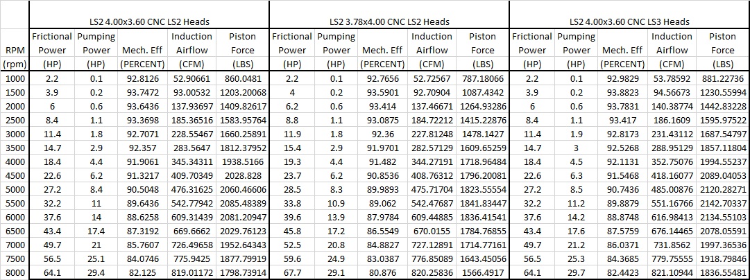 Data below shows frictional losses for longer stroke are greater (no surprise). Pumping losses are slightly better for longer stroke (no surprise again). Mechanical efficiency favors the larger bore slightly. Both LS2 headed combinations flow nearly same airflow (again - I did not alter flowbench data for smaller bore). All of these are relatively small differences - up until you get to the aforementioned piston force. Now you see the primary difference between the combinations.
