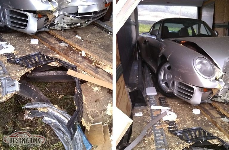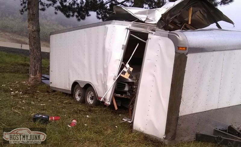 the Reason for the Damage - Trailer came unhitched from the tow vehicle, went off on it's own & hit a Tree. the 959 came unhooked in side the trailer for more damage!