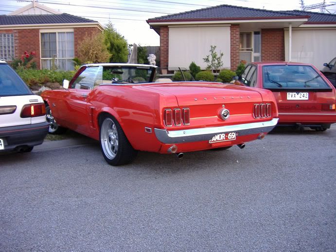 since you guys like seing pics and it is an american muscle car site, here are some pics of my cousins 69 mustang convertable, imported from california car still left hand drive (Australia is RHD) car was in not the best of conditions... stripped it down n started from scratch, re done the inside in tan leather, ripped out the 289 n threw in a 302, resprayed in candy apple red, 17" twister billets, x2 15" subs etc... with more work on the way to make this thing tougher...