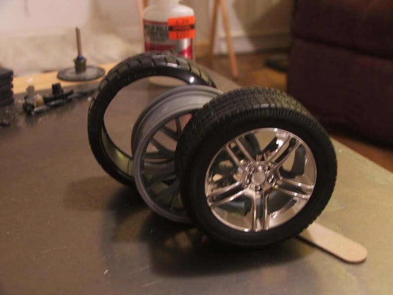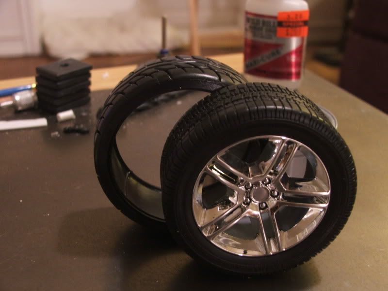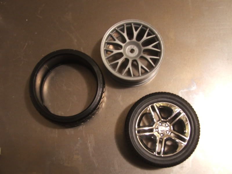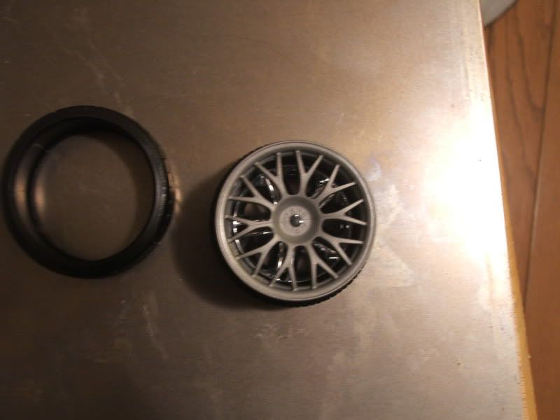 I have been following along for a while and i feel your dissapointment with the wheels. I too have had no luck with wheels. All i did was go to my local hobbie shop to see what they have and this is what I found. These are RC wheels with Tamiya tires. Looks like they are 18 inch wheels.I had to modify the tires to fit the wheels. Maybe you can modify the wheels to fit your inserts. If i were you i would stick with your original engine if you still have it. It was coming along nicely. As for the turbos you are doing an awsume job. Dont stop keep going. Like you i been on this thing for 4 yrs now. Recently tryed doing the Rally sport option with the results you see. If you have any question about the wheels i will be more happy to answer them.