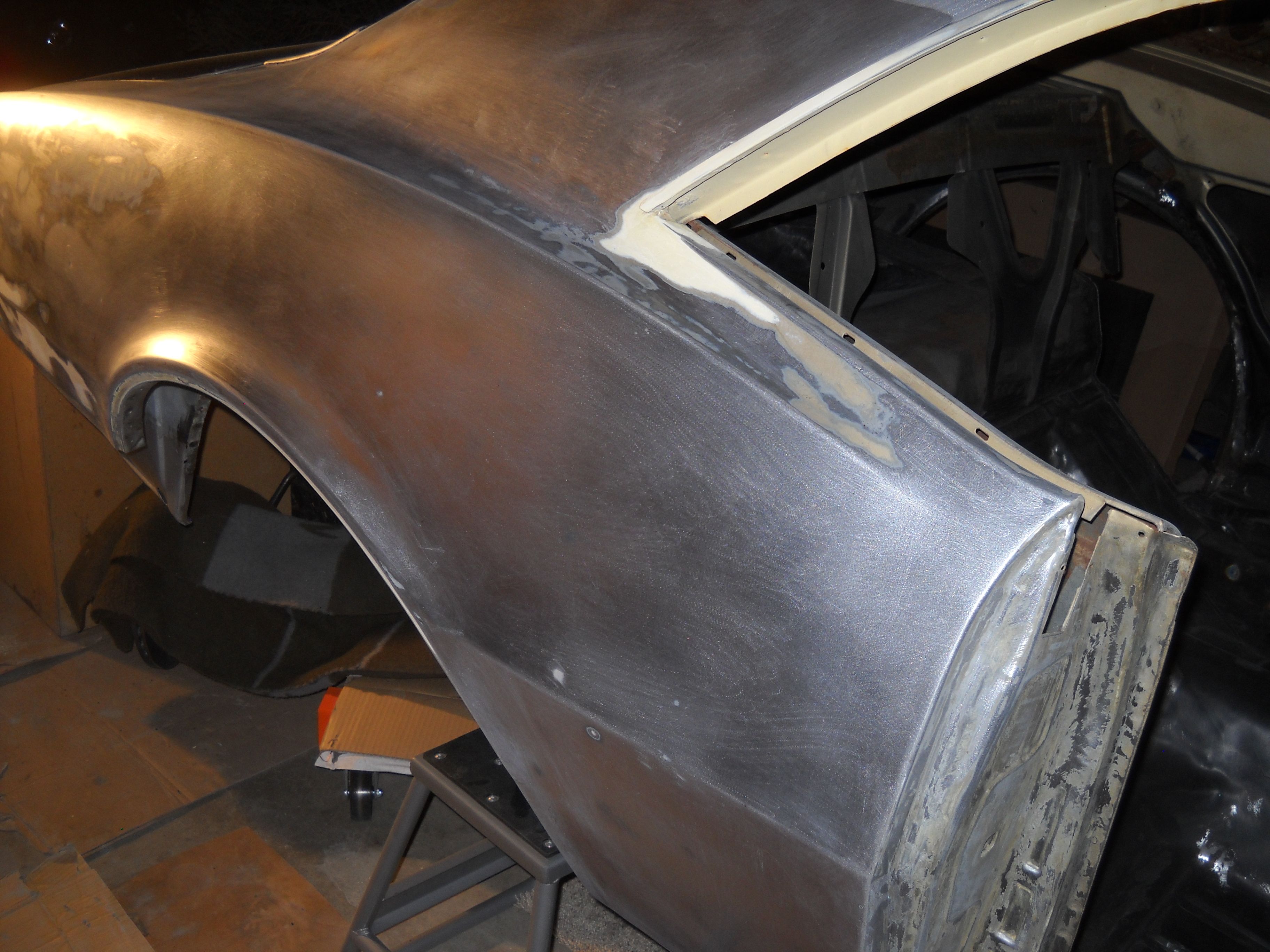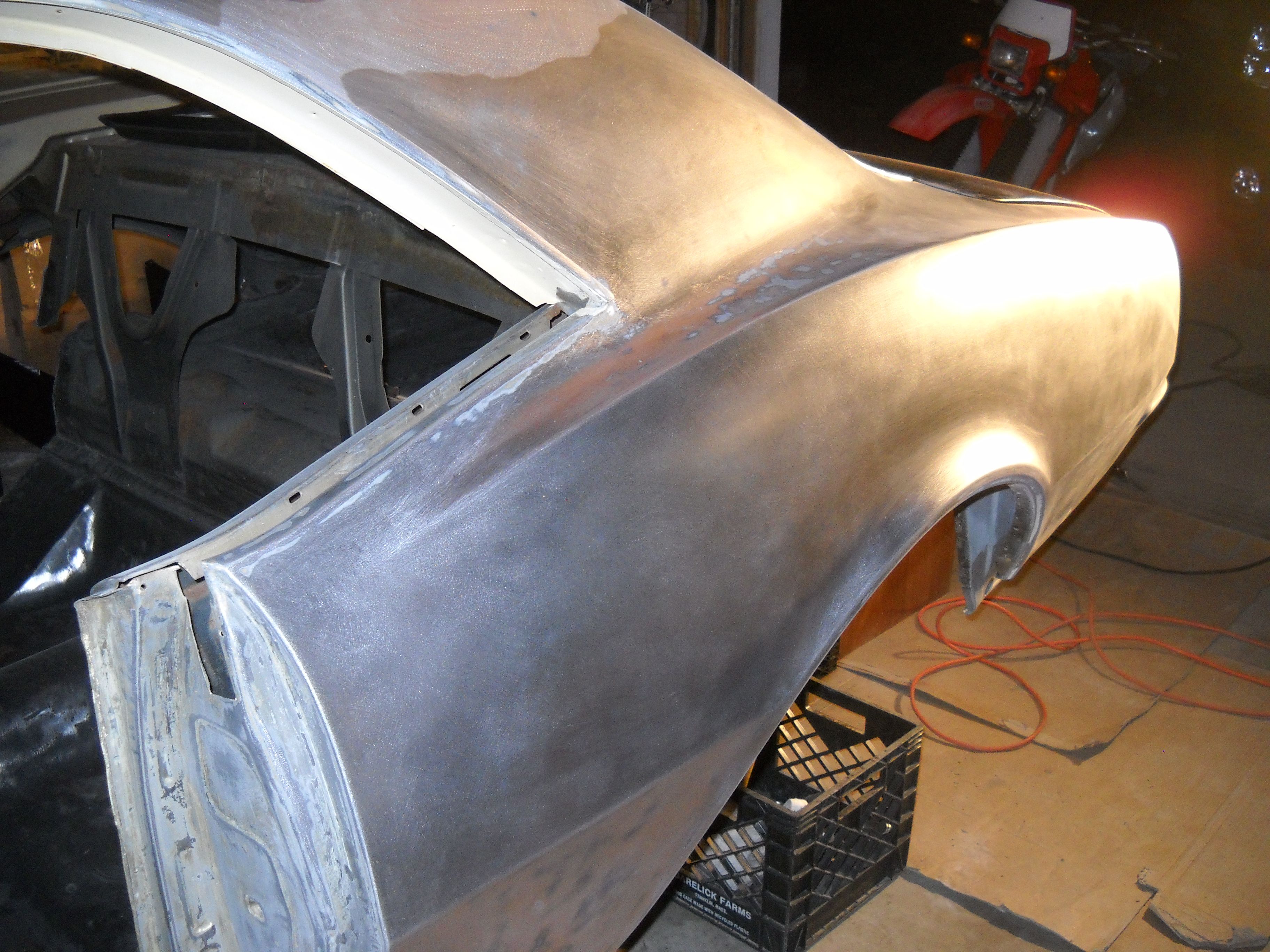 sanding the quarters! I didn't get the door prepped, IAW POR15 if you let it dry overnite you have to rough the skin with a scotch brite and then you can topcoat. I'll rough it up this week and take it to work and get some black on the door.