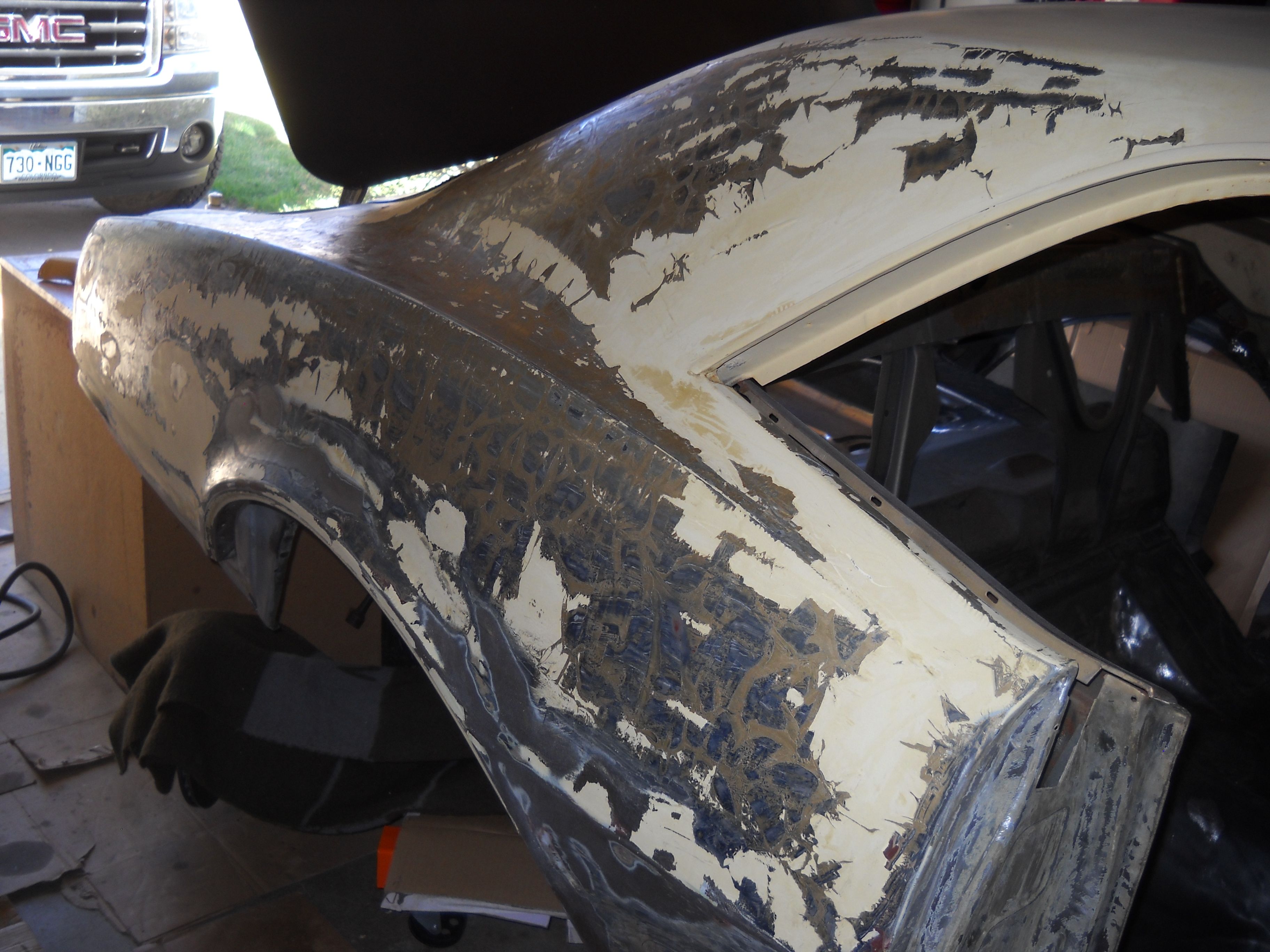 So plan B, get the quarters down to metal and see if there are any surprises under all that paint. Chemical and mechanical stripping started and I almost finished in one day ...