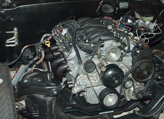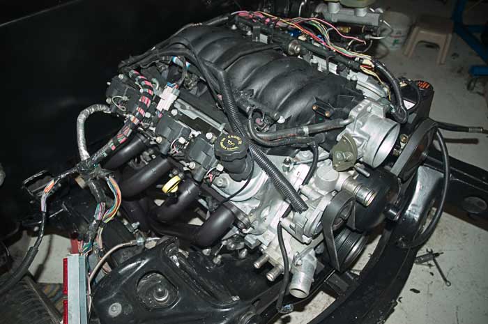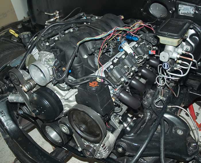 I have finally bolted the engine in place to stay. It has been in and out many times. Now I have started to hook up the harness and rerouting some of the connectors. Haven't decided yet where to put the box, probably under the right fender.