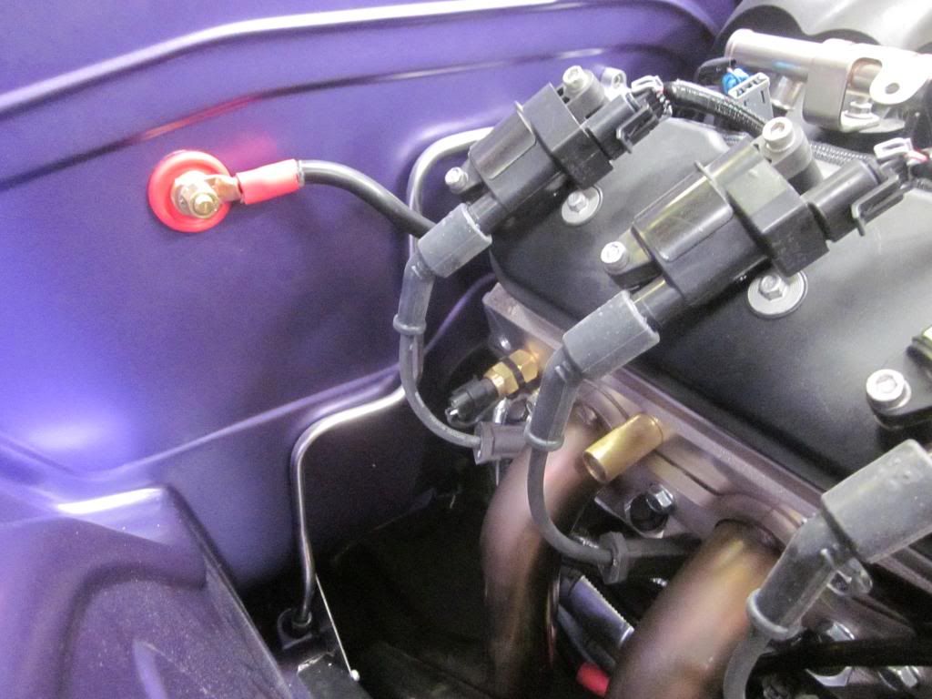 Here an after thought when I was mounting the battery.. We are arunning a 17 lbs Braille Battery tucked underneth the dash.. So I had to figure a way to jump start the car or put a trickle charger.. We machined a brass bung to mount to the side of the block for ground that was close to our power source in the engine bay.. I am sure we could have done something better.. but weight is a big factor on this car.. didn't want to run cable all over the place..