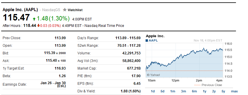 Market cap is the size of the company. Apple's market cap is $677 billion which is calculated by multiplying the number of outstanding shares by the stock price. You may have heard of large cap stocks, small cap stocks,etc. It refers to the market cap of the stock.