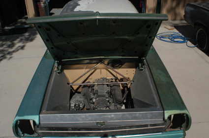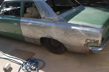 this is what i did all day.... sand all the bondo out of my left qtr .from an old repair looks like its from a parking lot incident.i knew it was there just decided to remove all the filler...oh and i stripped most of the roof down.tommorrow ill strip all of it and the deck lid ....GETTING READY FOR SOME REAL FUN........ PRIME AND BLOCK......YUK!!! OH I THREW IN ANOTHER SIDE SHOT and engine shot .bondo dust included.