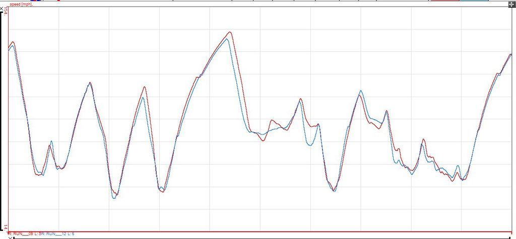 Below is an overlay of Hellfire best lap and JA 2.0 best lap. JA was 2 seconds a lap faster than Hellfire. I know JA can go faster because my "best" lap was without power steering and a small amount of smoke coming up through the shifter boot. So with power steering and not worrying if the car was going to burst into flames I think it had another 2 seconds in it.