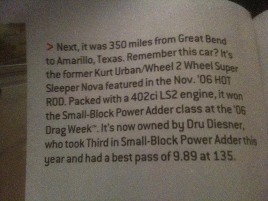 Just got back from Dragweek on Saturday. We won small block power adder class with a 9.30 et average and a 148mph average. The car now has another 1600 miles on it!