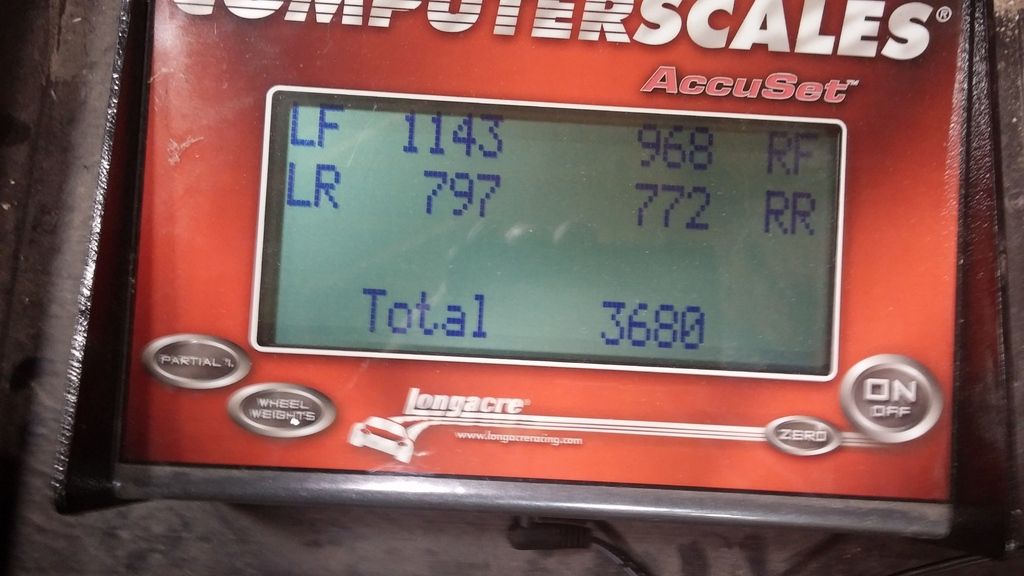 Car still has 57% on the front just a little bit less than before is all. Cross is within a half a point of the total right weight which is where Ron likes to see the cross on a left heavy car like mine. Right front could use 10 more pounds or so but that isn't enough to mess with making changes in our eyes. Overall I'm happy with it, really good to see it under 3500#s now.