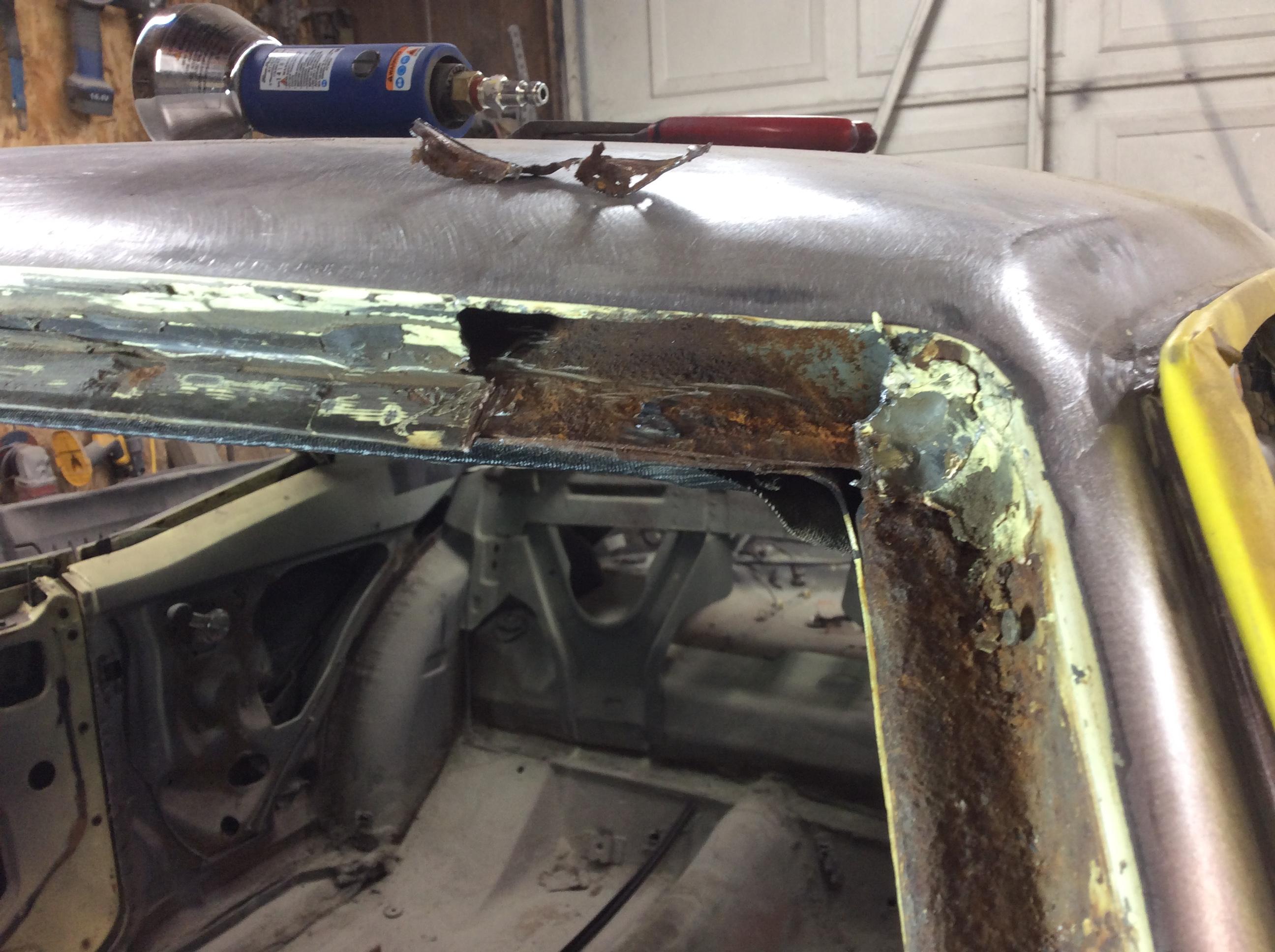 So this car was an all original paint car. The plan was to to just leave it as is. Although not a pretty patina... That was the plan. Well... My buddy Jim, aka Painter, said... Come on... Let's just do a quick scuff and shoot. Make it look a little nicer. So James ended up scuffing the whole car with 220. Joey, little bro, even got in the mix working on the hood for us. We took it to Jim's and the plan was to toss a few coats of filler primer on it, quick block and be done. We'll... That escalated quickly. Turns out the paint was dead and was flaking off. So Jim stripped the entire car. We knew we had a couple rust spots that needed to be addressed. Aside from that though that car was extremely clean. When we gutted the inside we found a Lowenbrau beer cap under the drivers seat. This car had been sitting since 1983. Wonder how long that had been there? James was going to throw it away. I plan on cleaning it up and leaving it in the glove box. Keep that memory alive.