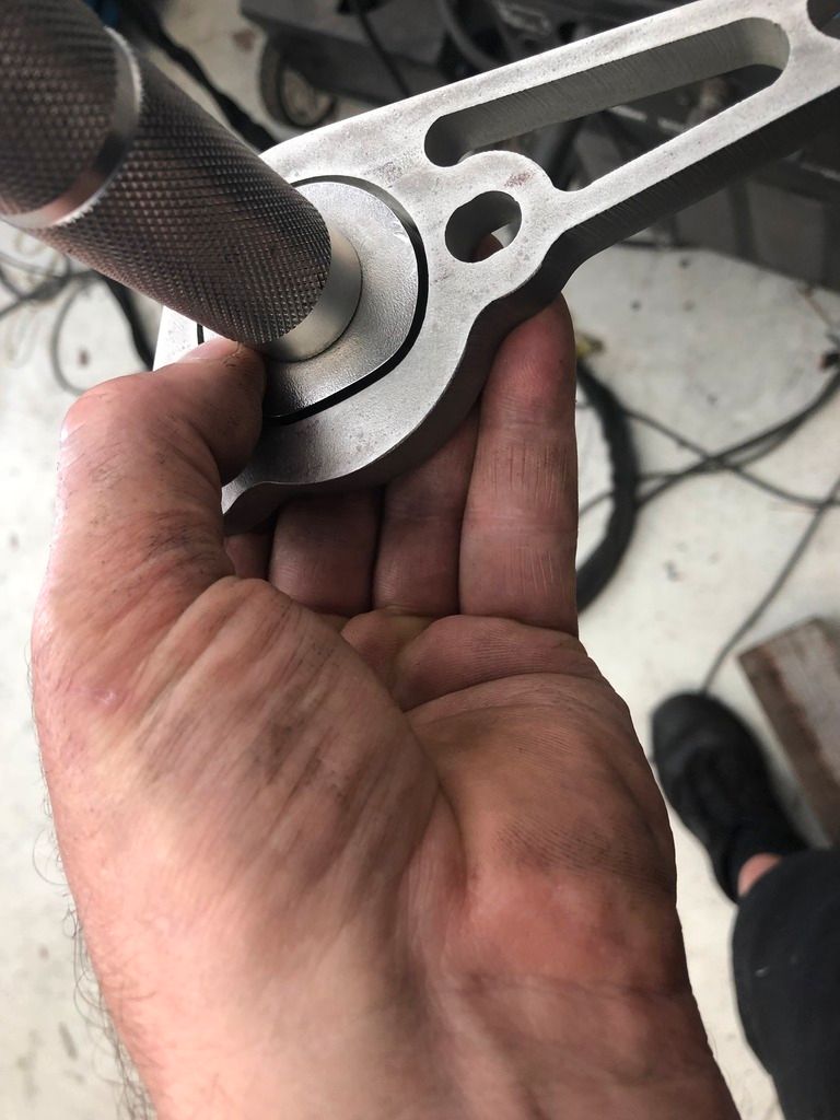 This slug is a perfect match to the port profile, and will make a nice forming tool. I reduced it's perimeter by about 0.050" to account for tubing wall thickness, rounded the edge that gets driven into the tube, and polished to keep it from grabbing. Drilled a hole (calibrated eyeball must be off center) and added a handle to have something to beat on!