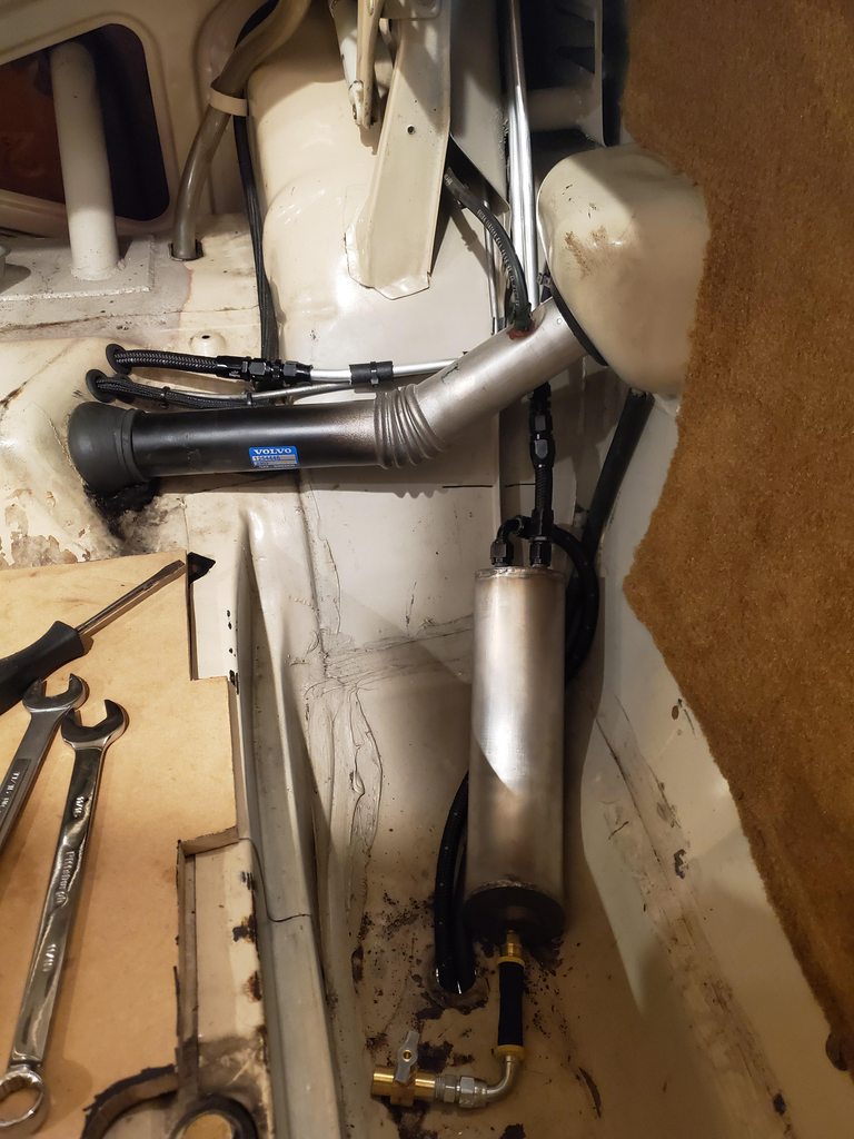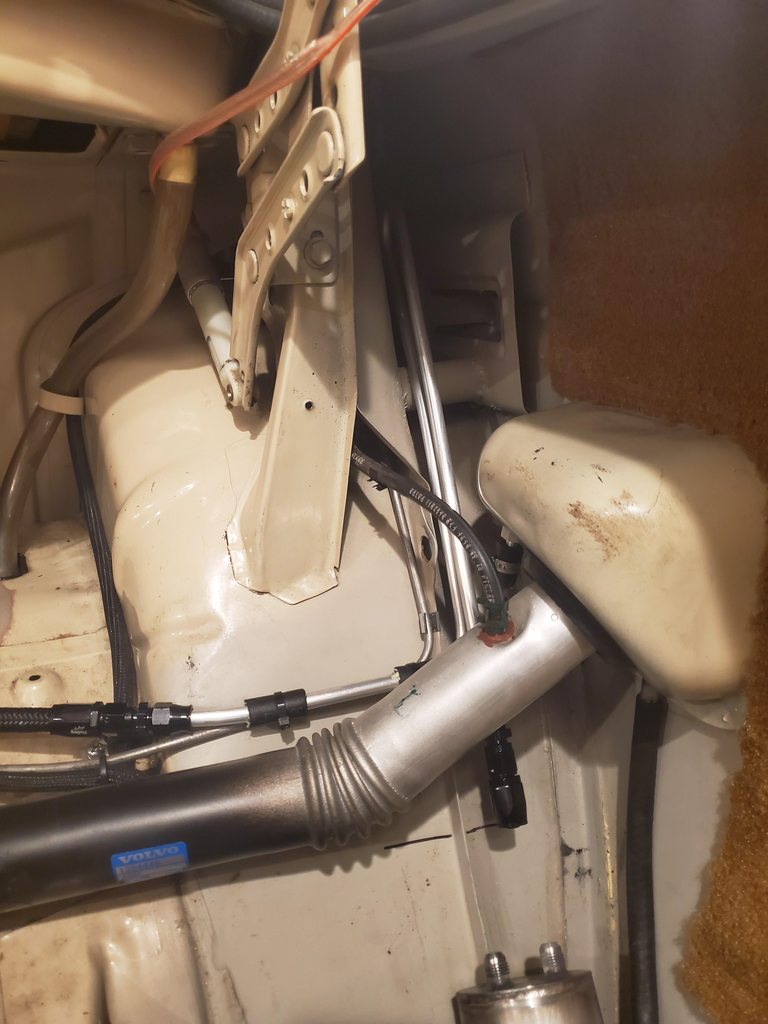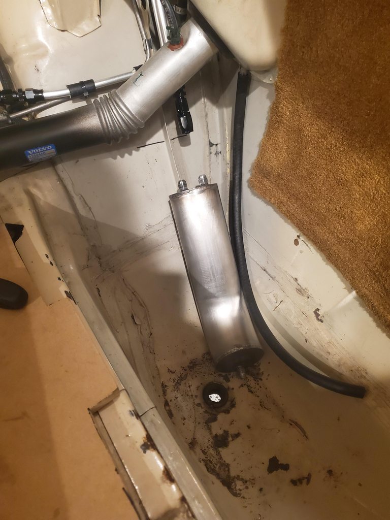 On the topic of pressurizing the fuel tank (especially in heat and with enthusiastic driving/Wally 450 pressures) the Falcon has always had some problem of this type, with both Ferd and LS engines. My latest attempt at relieving the dumb thing's pressure is a -8 rollover valve which is then plumbed to an old eBay catch can I've had forever. Here's hoping for less nasty in the trunk-ish area of the car.