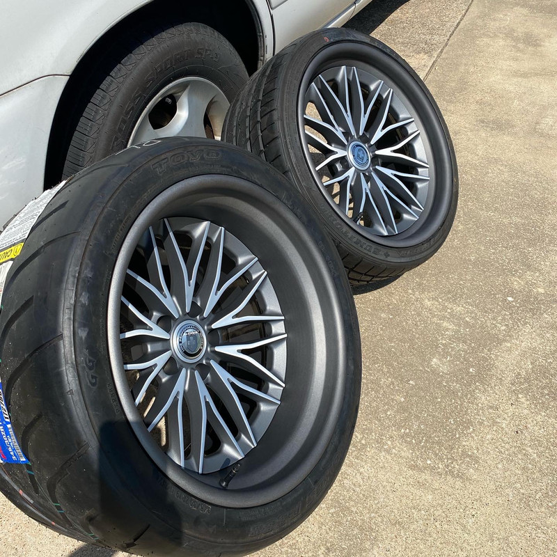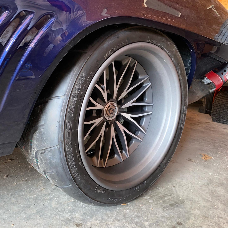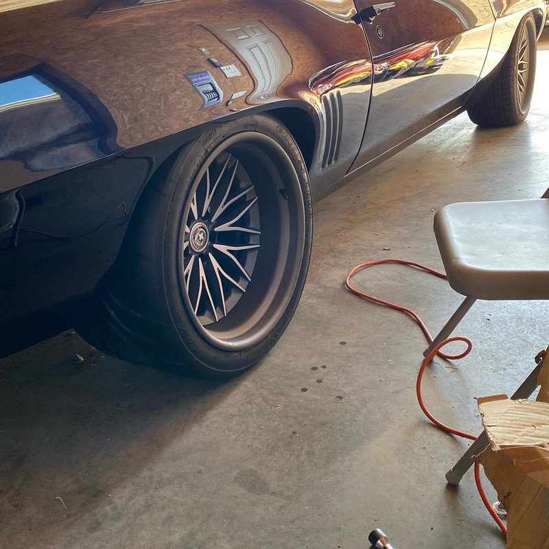 Got the wheels mounted yesterday. I'm happier than all outdoors just to see the car sitting on the ground now. I measured everything on my own and did it, literally 9-10 times. No lie!! I even bought different new tires and kept checking fitment. I was so nervous and afraid to turn in the numbers I had measured to HRE. They kept emailing me for my backspacing numbers, as I had already put down 50% deposit and I kept procrastinating. I'd buy different size tires from Discount Tire and return them, which is doable just so long as you don't mount them. I told the guys there what I was doing and they were happy to help. So, after checking my numbers a million times on several different tires I went off of hope and ordered the wheels. I was still worried, because the worst thing you want is to order super expensive wheels, only to get them after waiting and they don't fit. So, I was super excited to receive the wheels. After getting them mounted and balanced on the tires, the moment of truth came...."Ohh s#!t, I hope these wheels fit!" Low and behold, every thing was perfect. I probably could've added an extra .25" on the rear, but other than that, they're perfect. Tires are mismatch, cuz once I get the car running, I plan to have a tad bit of fun hopefully and burn a little rubber. I have a brand new set of Michelin Pilot Sports to mount afterwards. Now, that wheels are finally on and the car on the ground I can get the exhaust done and get it wired and start the car soon.