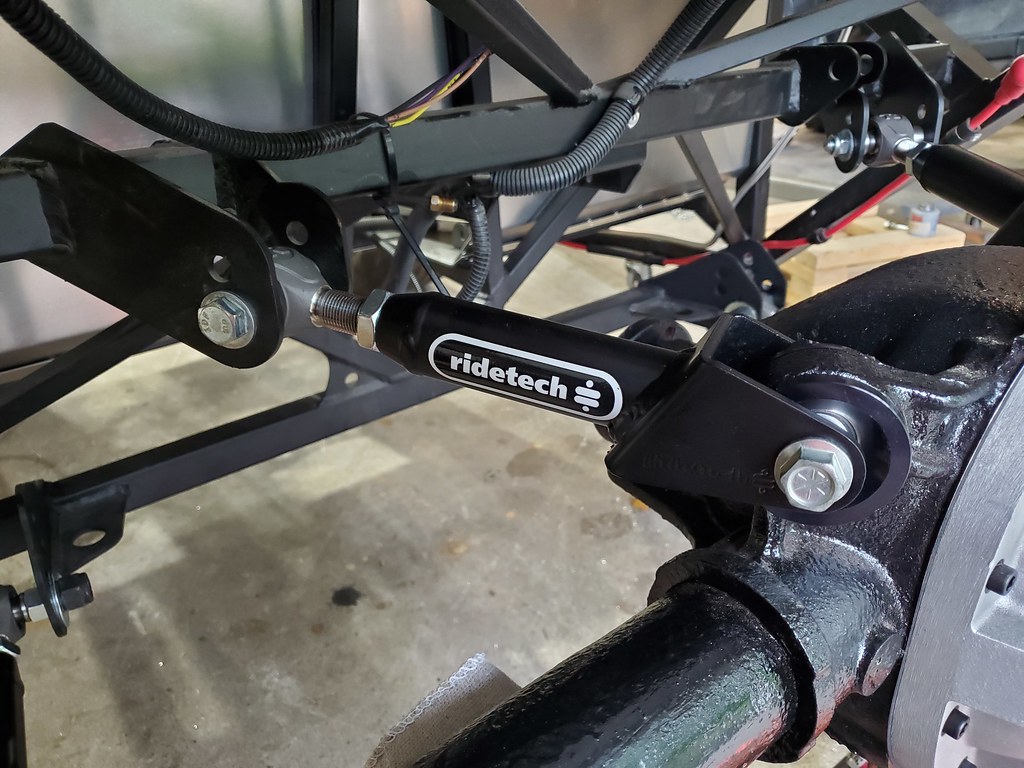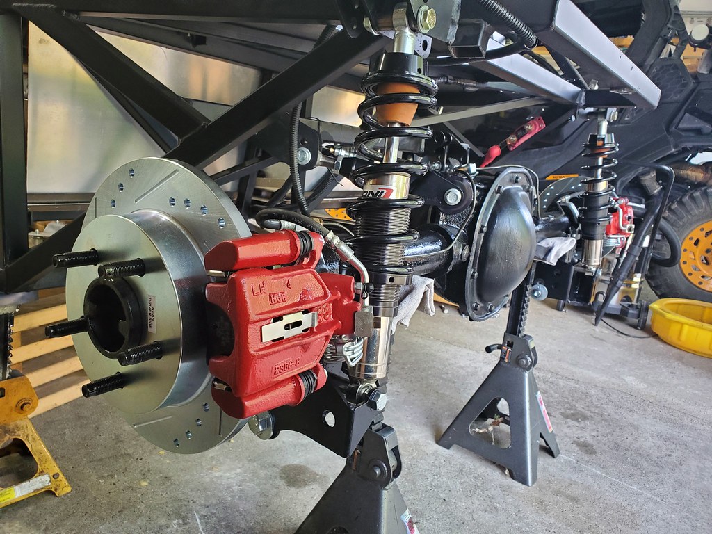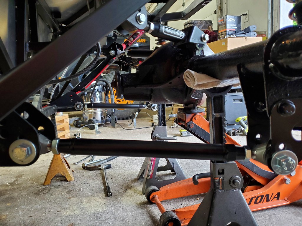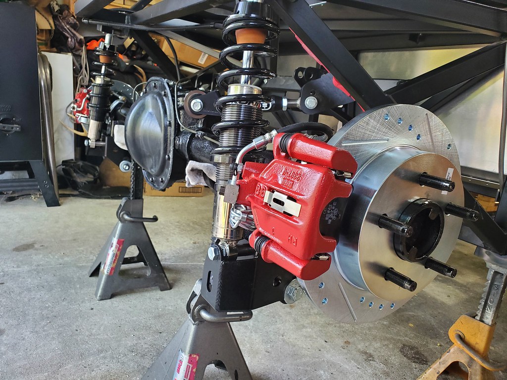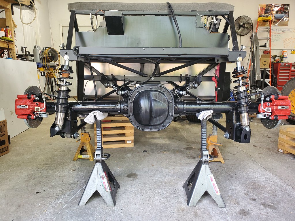 I haven't been doing much on the '33 but finally got back on it and got the rear end all buttoned up. Had Ridetech make me some upper and lower arms with "R" joints, BMR housing swivel bushings, cleaned and painted the calipers, new rotors and pads and all that's left is to bleed the system.