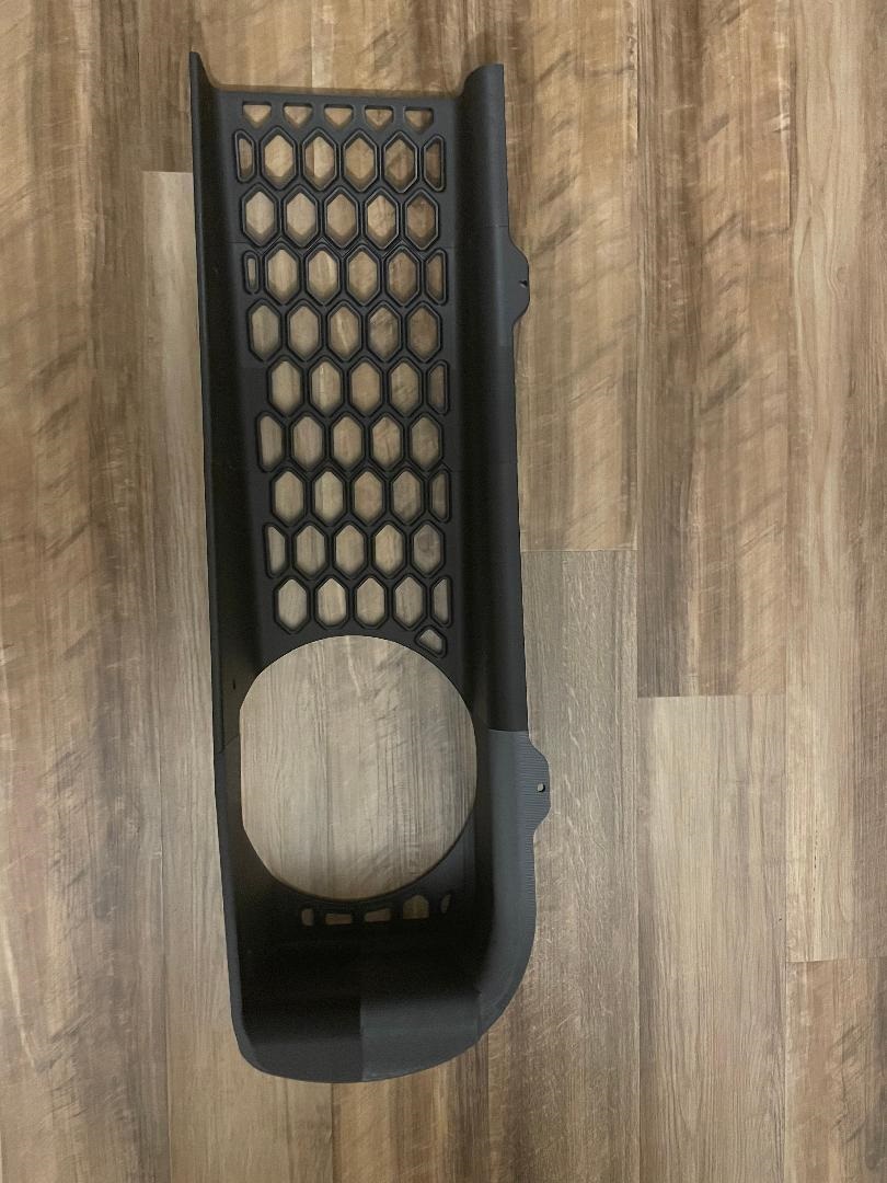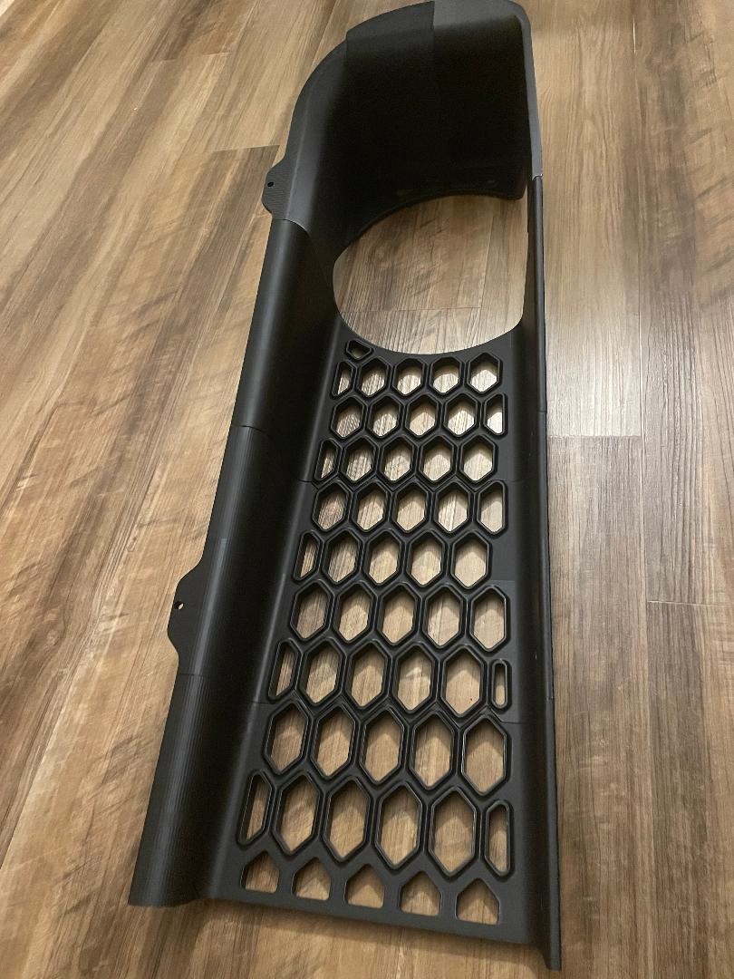 In continuing with my custom grill design, I had a few setbacks with having it 3D printed for test fitting. I was trying to save money and be cost effective by doing it out of foam at first, but that didn't work. They could never get the foam thick enough. So, I went ahead and opted for the 3D printed version. Here is the initial design. Still working on the mesh part. I'm pretty much locked in on the hex shapes. But the most important part are the dimensions and fit before sending the file to EVOD for CNC'ing. The mesh design can always be changed. Per Shaun at EVOD, the overall CNC cost will be significantly cheaper if the grill is made in two-halves and will bolt together in the center. Two billet blocks will be cheaper than one huge block to make the grill a one piece. Also, I picked up a NOS Caprice license plate holder from Ebay after Stielow posted it in his thread. I really needed this as I have the Ring Brothers battery charging ports where the fuel filler used to be. I had already been worried about how I'd charge the battery when the connections are in and the pressure from the Camaro license plate holder would be applied to them. The "flip down and stay" option of the Caprice plate frame holder was right on time.