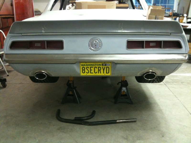 The Exhaust is done. Here are a couple pics from my iphone. Tim cut the rear valance for exhaust to exit. It has exhaust tips that have a resonator built in, gives it a factory tip look. Also he gave the opening a rolled edge that is real nice, its not a rolled edge all the way around, it fades into the valance at the bottom.