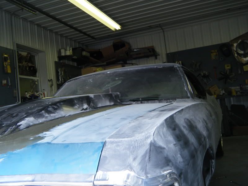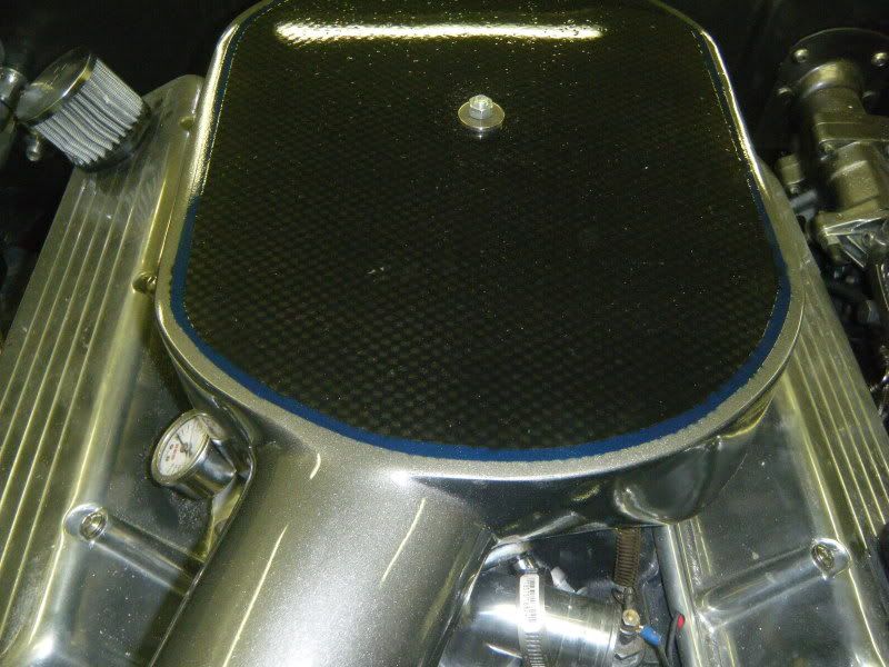 well its been far far too long since my last update. ive been kinda treading water on it for a little bit, but im started to near the end. i had a couple "oops" deals when wetsanding and buffing so i had to touch them up and put on an additional three coats of clear to make sure it wouldnt happen again. finall got the car all buffed out and cleaned up. im pretty impressed with my garage paintjob. theres a few imperfections but in the sun it looks great. i started finishing up the hood and decided that a molded cowl would function and finish better then my homemade version, so i knocked that out( hood is currently in primer.) its a 3.5" harwood scoop. it looks big in the pictures being unfinished but in primer it kinda gets swallowed up by the cars massiveness. i finished the air cleaner assembly, it just needs buffed and striped. decided to add a little high tech to my rather old school car with some painted on carbon fiber look.( i just wanted to see if i could do it, havent decided if i should keep it or not). also got the wheelwells sprayed in bedliner, for protection and to have a nice backdrop for the wheels.