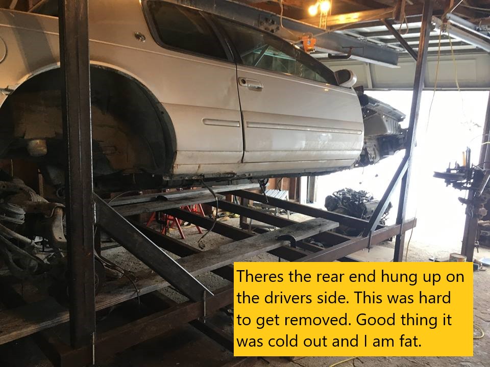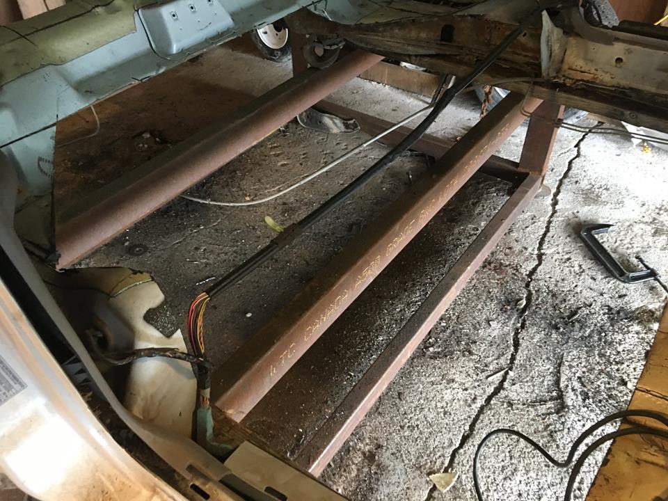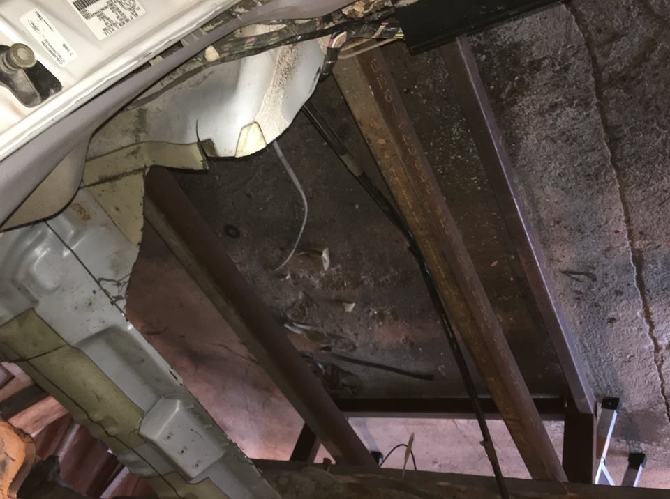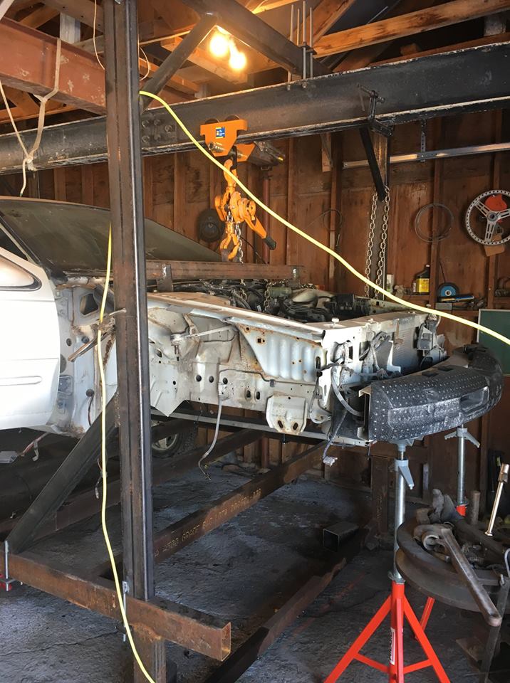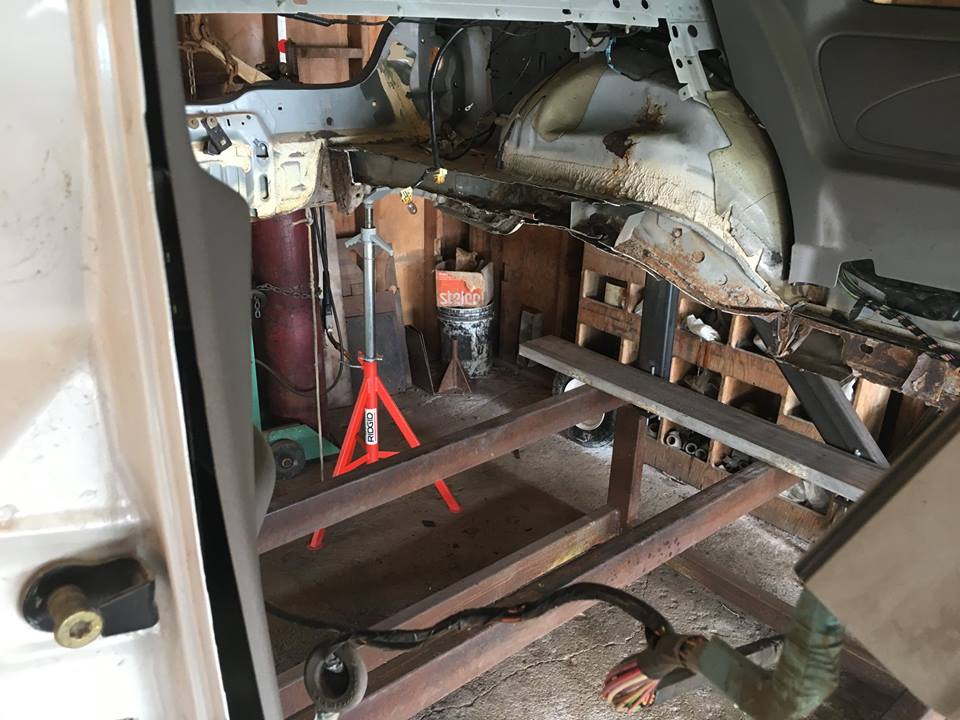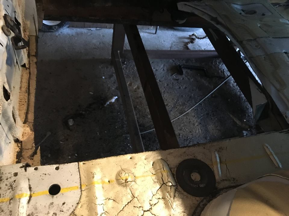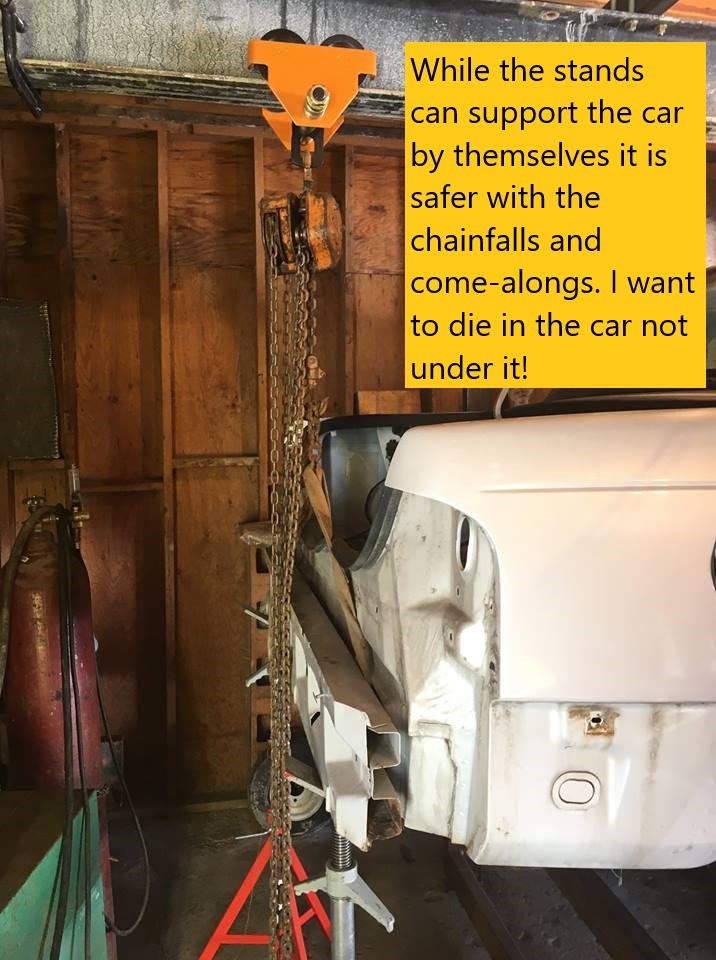 We are getting a little braver with our cutting. The body is hanging from its 2 lifting fixtures. When I am underneath I also add the rigid pipe stands for extra safety.