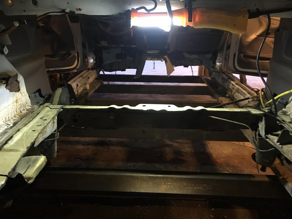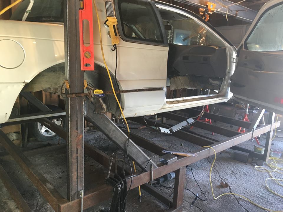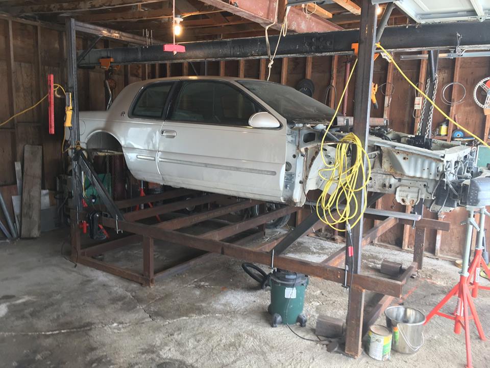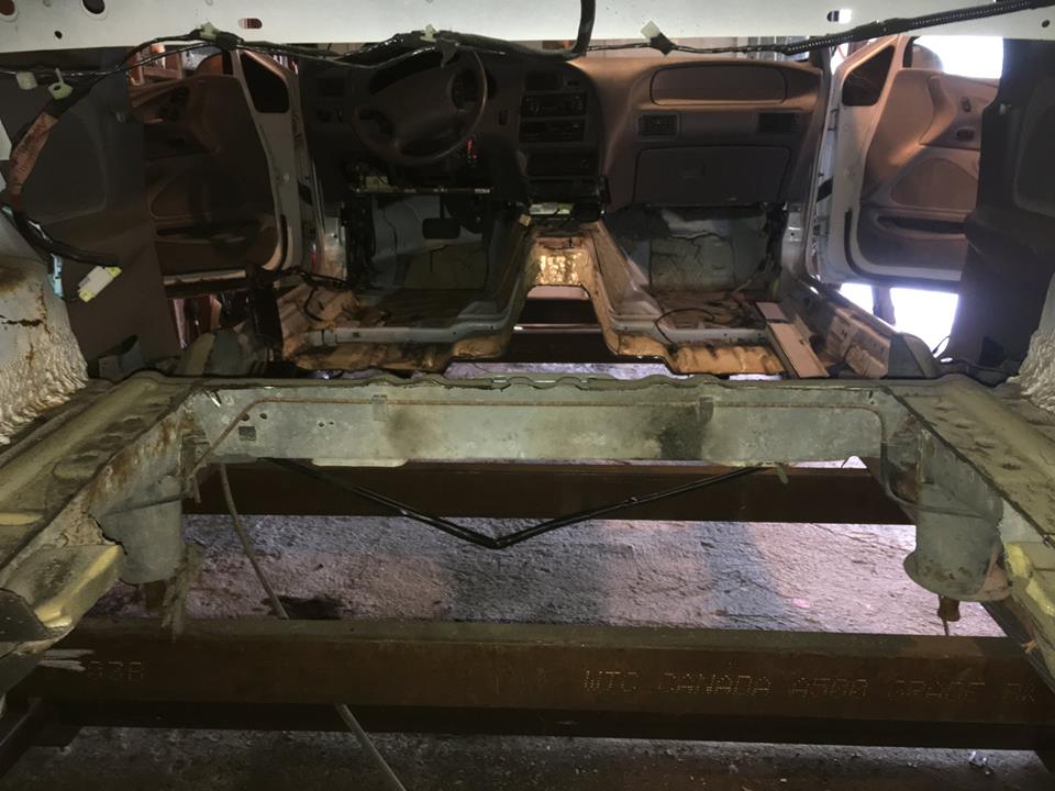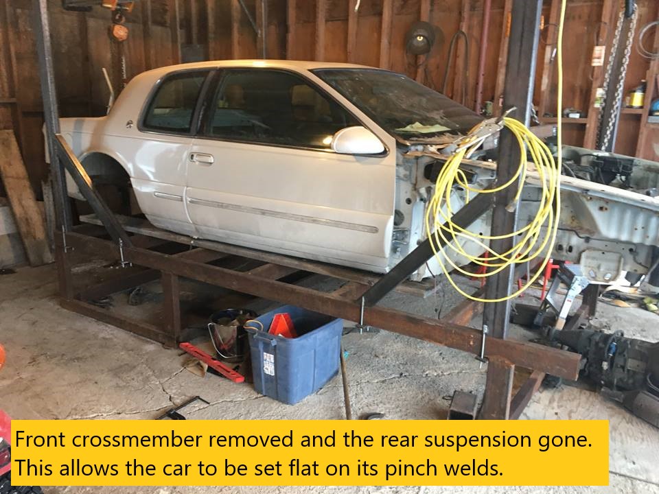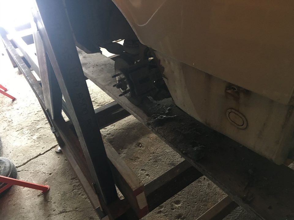 We are getting a little braver with our cutting. The body is hanging from its 2 lifting fixtures. When I am underneath I also add the rigid pipe stands for extra safety.