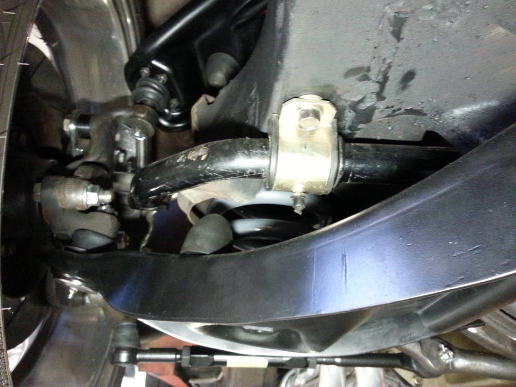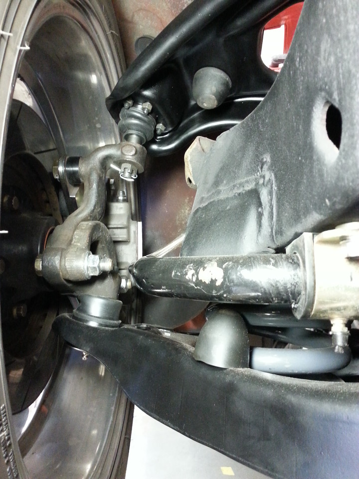 Now the issues.......previously I was not running lower bump stops and never have experienced harsh bottoming or coil bind.  I installed some 1-5/8" cone bump stops on the lower arms and that leaves 1/2" to 5/8" free space between the bump stops and the frame stops.........not good, nor is the anti-roll bar relationship to the lower arm.  That bar bushing grease zerk has 1" clearance from the lower arm......I'm thinking grease it remove the zerk and plug it just to be safe.