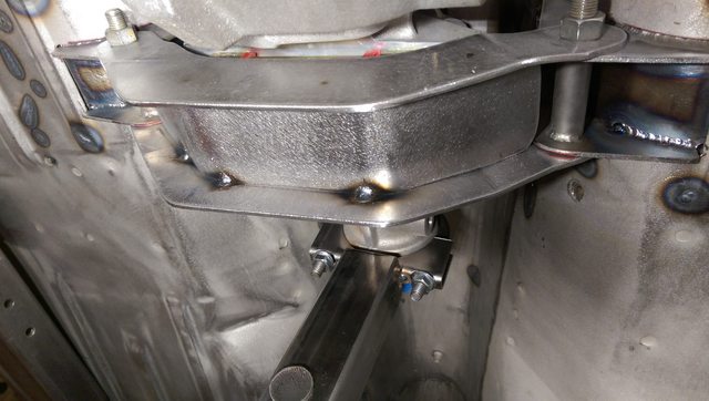This week I finished the transmission cross-member (almost). I started by finish welding all the brackets and doing a final fit check in the car.