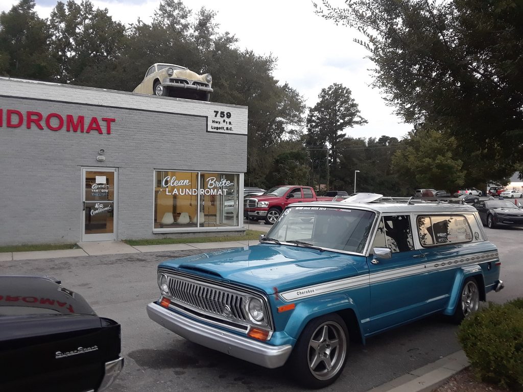 We were able to find the piston rings he needed in Mooresville at Prock Performance. Jeff Prock (yep, that Jeff Prock) was kind enough to open the shop for us and even gave us some shirts. Of course we had to get a picture of him with the Jeep. You can also see the tape on the hood - we decided on Sunday to run sealed hood for the week. It's a street car so why not.