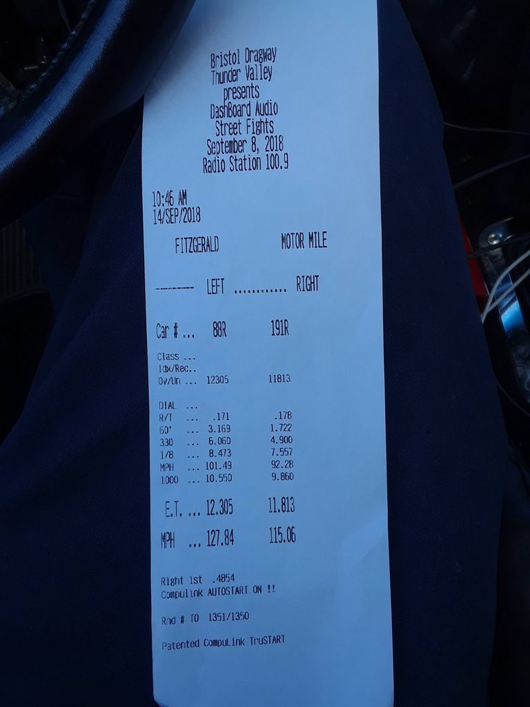 Went out and made an outstanding pass for the crummy conditions. Grabbed the time slip and what?! It definitely did not run a 12.3 @ 127 on that pass.