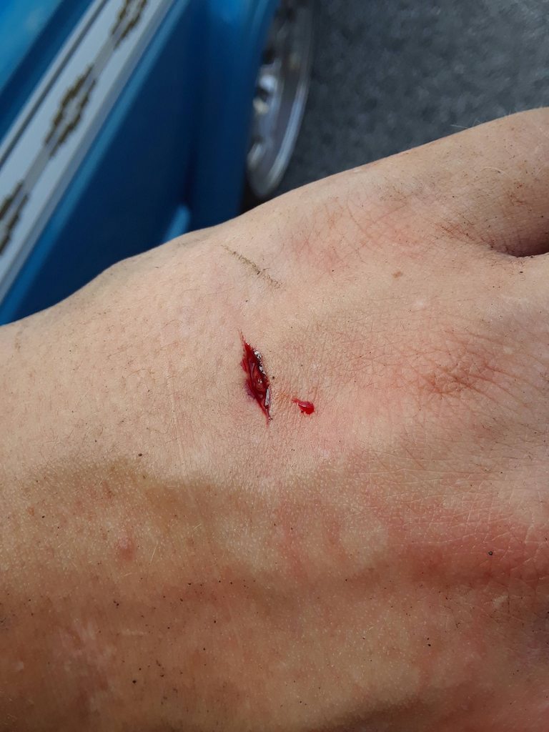 Only injury of Drag Week. Left the track with the intentions of going straight to the hotel and sleeping for about 12 hours. Well, the tailgate window was stuck in the down position. Can't access the motor or any of the wiring with the window down, huge pain in the butt job. In the process of removing the motor, the spring loaded lift arm got me. Finally got the issue troubleshooted and made it to a store for some bandaids.