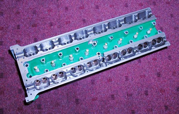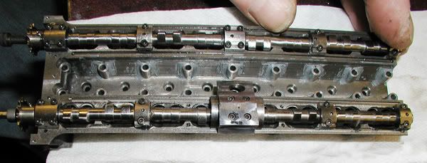 Here is the head (before painting) with the camshafts in place--there are 16 lobes on each shaft.