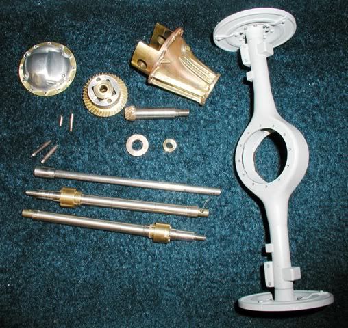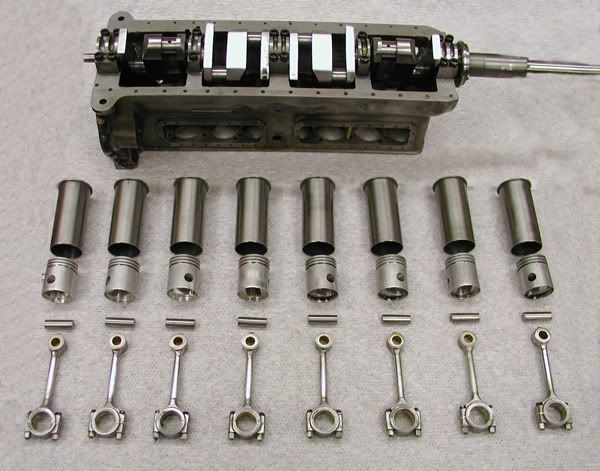 Inside the straight eight engine are all the correct parts custom machined to scale from steel, cast iron and aluminum. Here we see the block and crankshaft at the top. Arrayed below the block are the cast iron cylinder sleeves, pistons, wrist pins and assembled connecting rods.