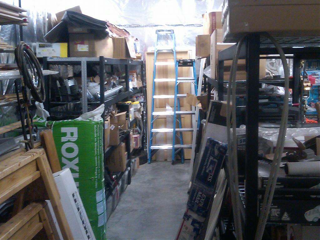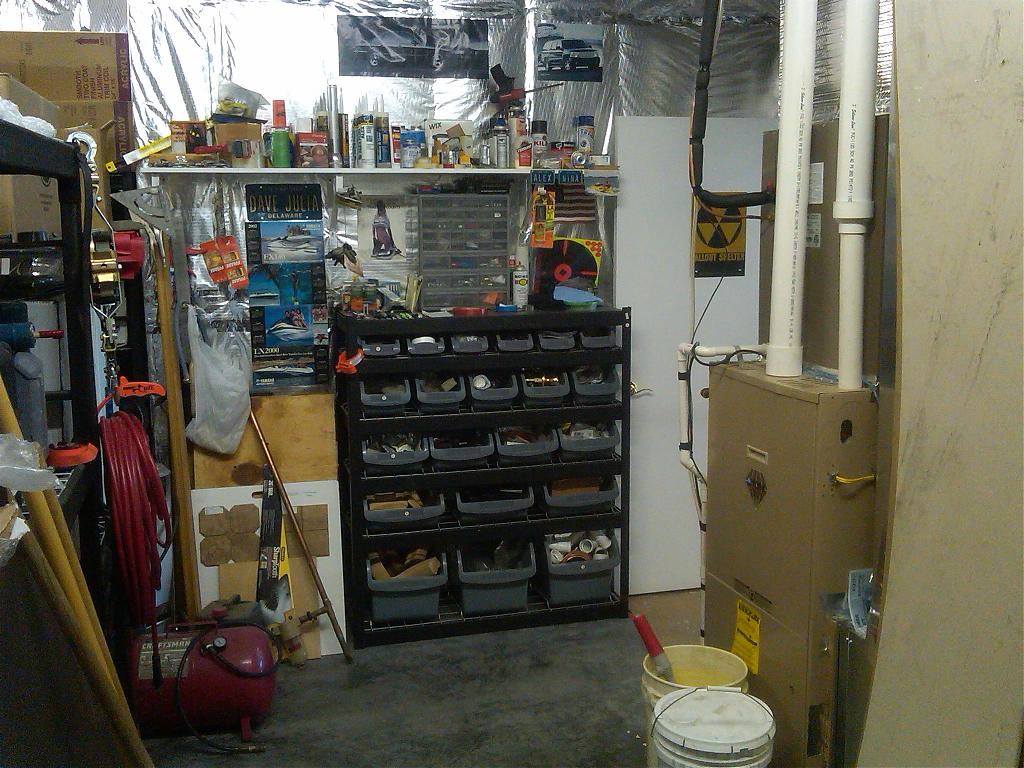 Ok so here is a few pics of my garage. Its 785 sq feet with skylights and a overhead trolley with electric hoist. Only thing sucks is no storage in the attic with this idea. So Sinco ( member) and I made some cabinets with 200lb per draw capacity and buckets fit in the bottom draw.Thanks Doug.