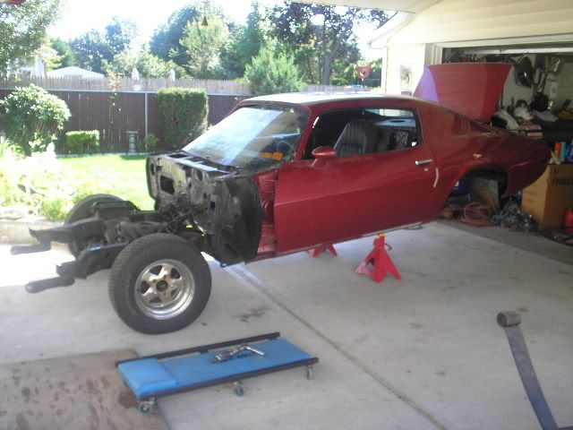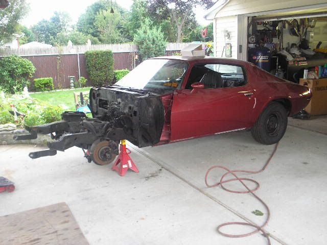 my name is Joe. I'm building a 1972 Camaro with a drivetrain out of a 2004 GTO with a procharger setup. I'm a senior in high school and I work 40 hours a week at a local gas station to afford paying for this car. I'm kind of midway with the car so I'll try and put up as many old pics as I have so everyone knows what's going on. I've had the car since I was in the 8th grade and I paid for everything myself. The car is being built in pro-touring style and I plan on taking it on the track as much as I can. I found the car from my father's friend who has had it since it was new (have pictures of the car new) which he took apart from the start and was going to make it into a race car. He took it all apart, painted it and that's where she sat since 1978 to 2006. The car has 22,000 original miles and is an original SuperSport. The body didn't have one spec of rust and the car is all original panels