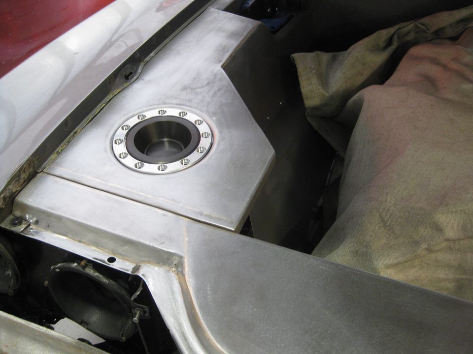 One of the uses we came up with is using the large diameter filler with our universal mounting ring. The bolt pattern is the same as your typical fuel cell mounting ring and slips right over the studs.