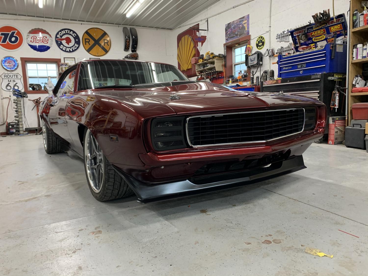 Miscellaneous body work photos. Cleaning up all the gaps and edges. Releaded the quarter seams and A-pillar. Notice the lower ground effect as well. At this point I was unsure if they would look right. Seemed to make the car look too thick. I later decided to paint the lower effects Flat metallic black. This made them less dominate visually and really add to the overall look of the car. My trip to SEMA back in 18' was spent researching wheel and tire sizes. My conclusion was that 20" wheels were just too large for what I was building. After 3 days of photos and arguing with my buddies, as I was leaving the main hall, there at the entrance was a beautiful orange 69 with 19" rears and 18" fronts...Perfect!